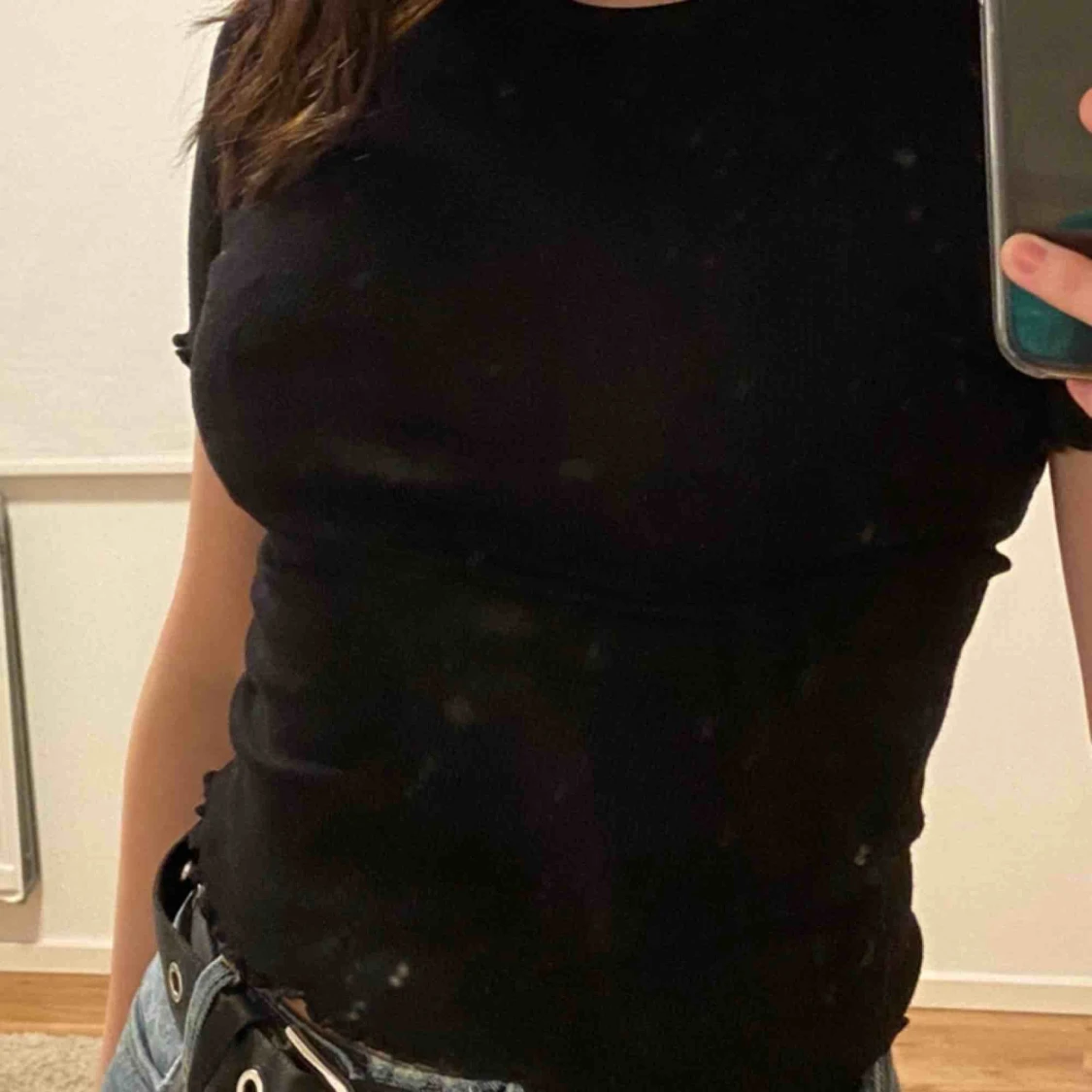 jättefin ribbad t-shirt med lite volanger på ärmarna och längst ned på tröjan🥰