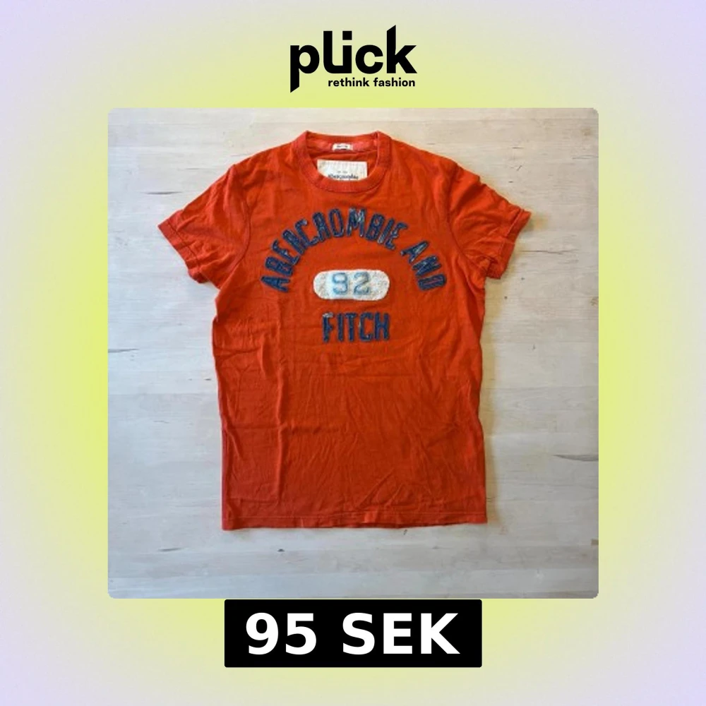 Snygg orange t-shirt från Abercrombie & Fitch med blått lappat tryck och siffran 92 i vitt på bröstet. Klassisk rund hals och korta ärmar. Materialet är mjuk bomull och passformen är slim muscle fit. Perfekt för dig som gillar casual stil. Storlek S, fint skick.