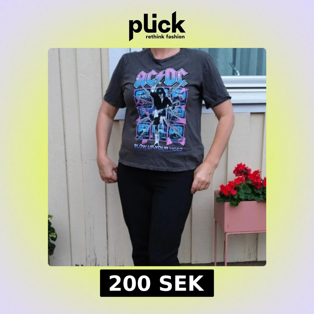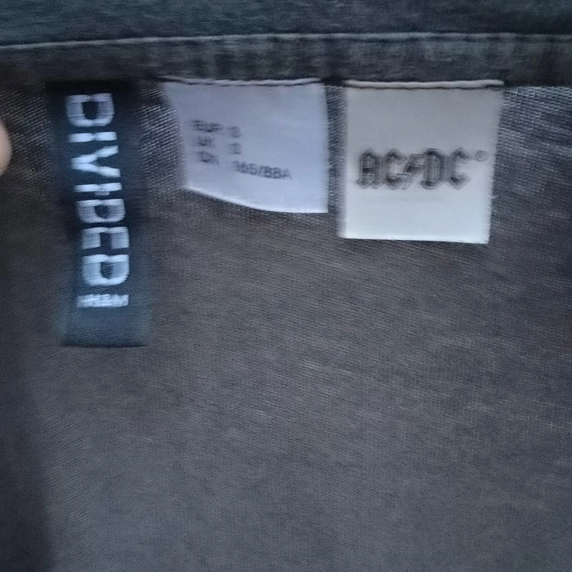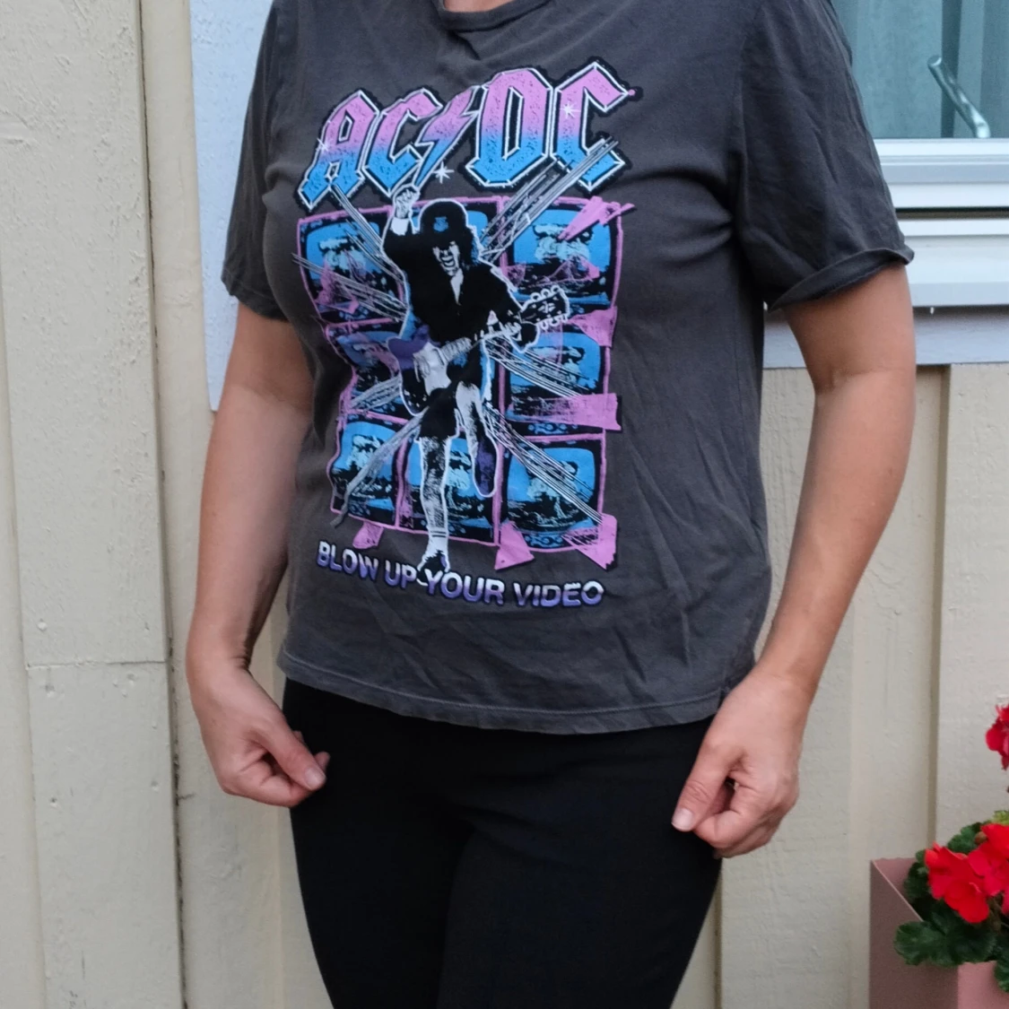Cool svart AC/DC t-shirt från H&M Divided med färgstarkt tryck i blått och rosa, inspirerat av albumet Blow Up Your Video. T-shirten är kortärmad och har en normal passform. Materialet är 100% bomull, ACDC Blow Up Your Video World Tour T-shirt Dam L Grå Kortärmad Rund Hals