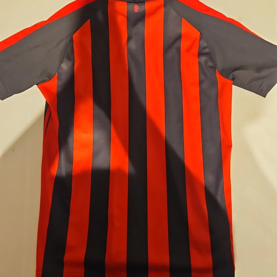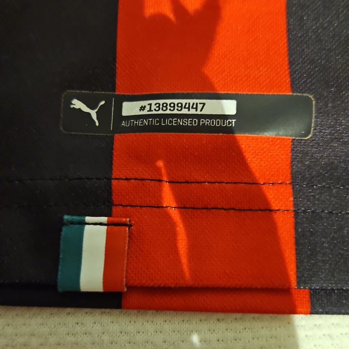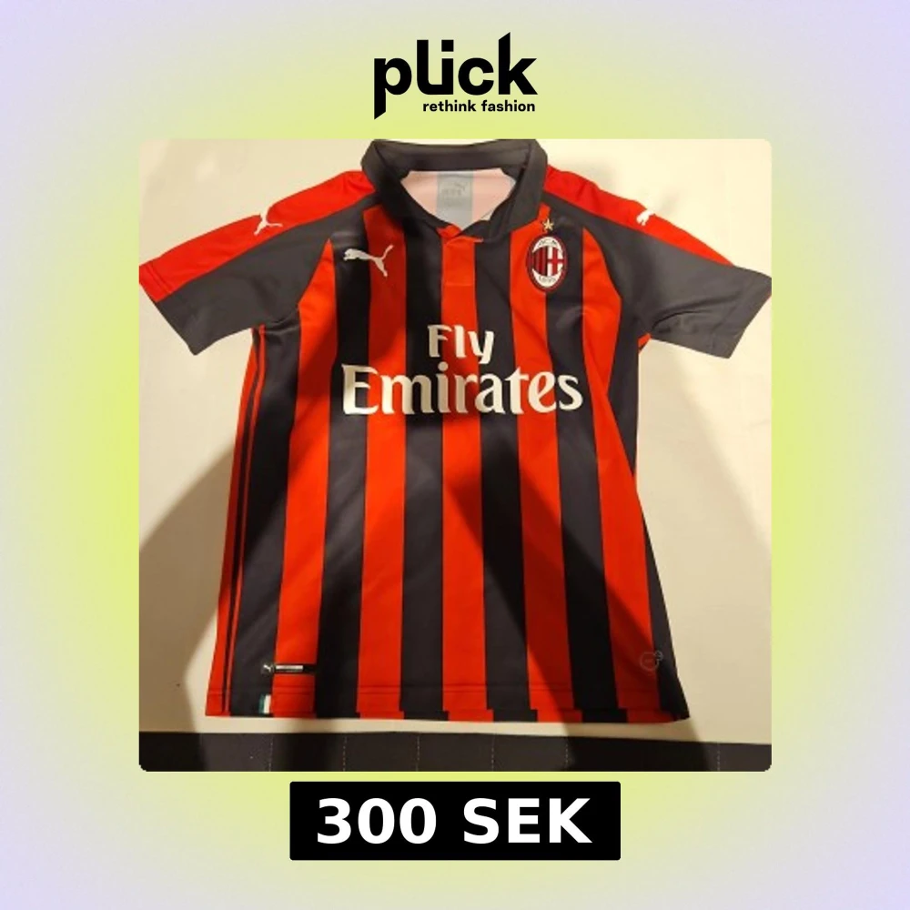 AC Milan matchtröja från Puma med klassiska röda och svarta vertikala ränder, klubbmärke på bröstet och Fly Emirates-tryck. Kortärmad modell i lätt polyester, med italiensk flaggdetalj vid nederkant och vit Puma-logga på axlarna.