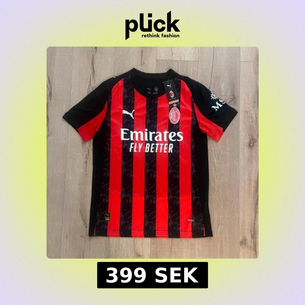 AC Milan fotbollströja från Puma i storlek S. Tröjan har klassiska röda och svarta vertikala ränder, klubbmärke på bröstet och sponsortryck. Materialet är lätt polyester med rund hals och korta ärmar. Perfekt för dig som vill representera Milan på träning eller match.