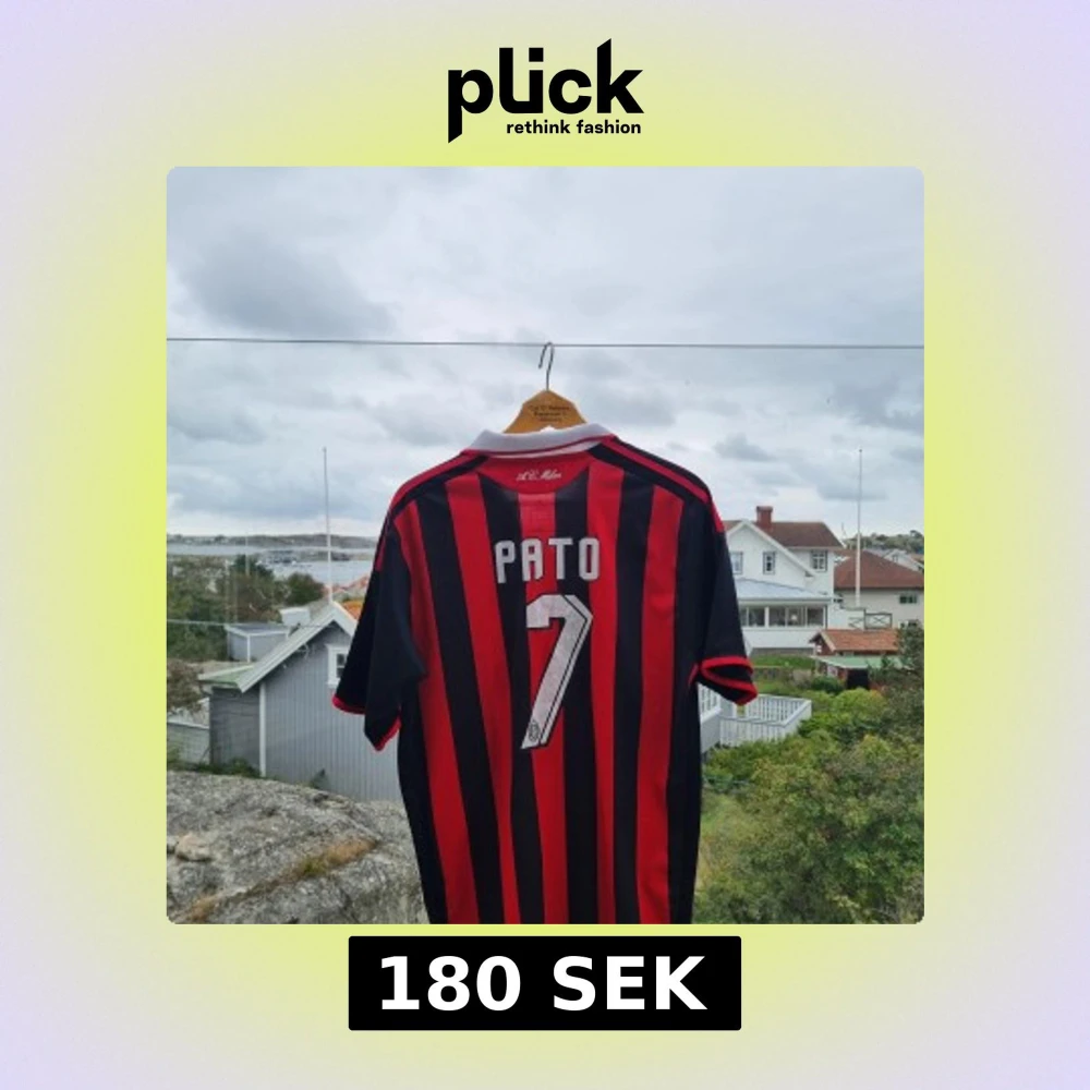 Säljer en klassisk AC Milan fotbollströja med Pato och nummer 7 på ryggen. Tröjan har svart och rött randigt mönster, vit krage och röda detaljer vid ärmslut. Officiell Adidas-logga och klubbmärke på bröstet. Materialet är lätt och andas, perfekt för match eller träning.
