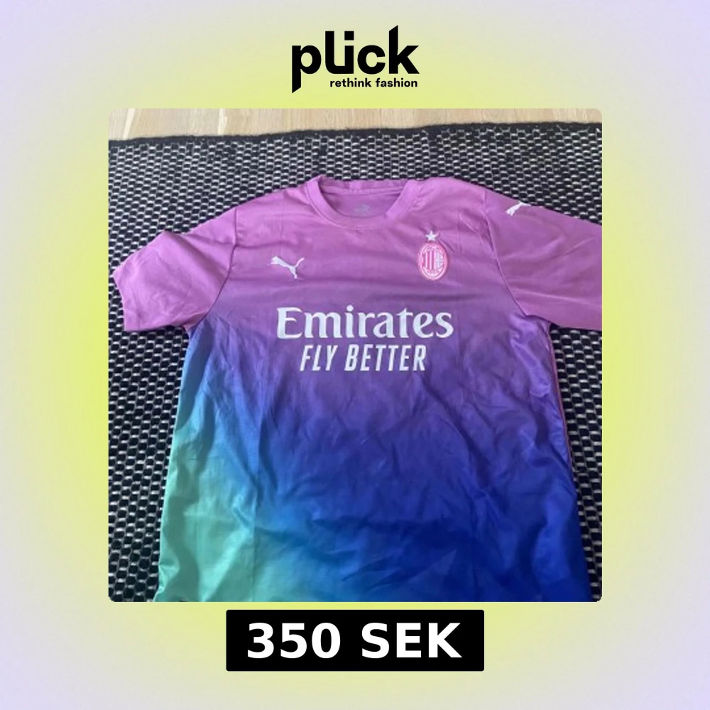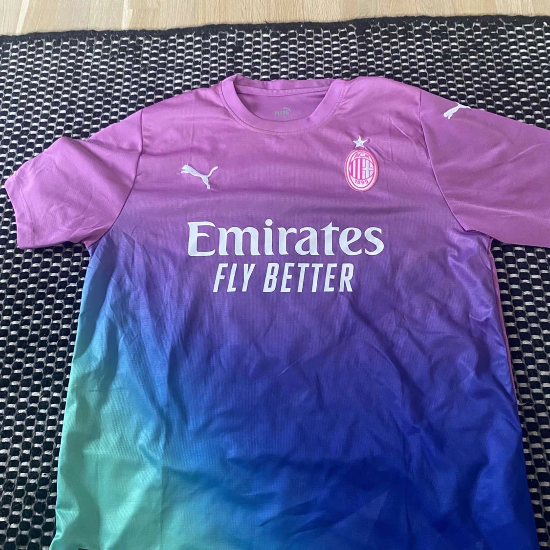 AC Milan fotbollströja med Loftus-Cheek och nummer 8 på ryggen. Tröjan har en snygg färgövergång från rosa upptill till blått och grönt nedtill, med vita tryck och klubbmärke. Korta ärmar och tillverkad i lätt funktionsmaterial, perfekt för match eller träning.