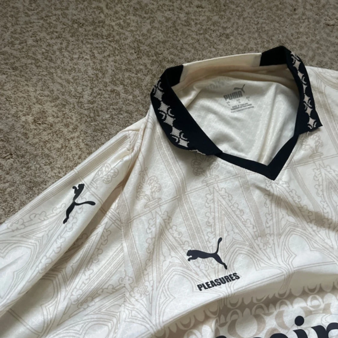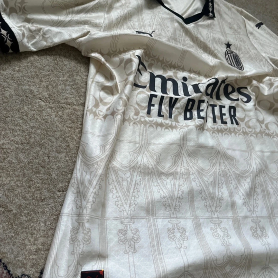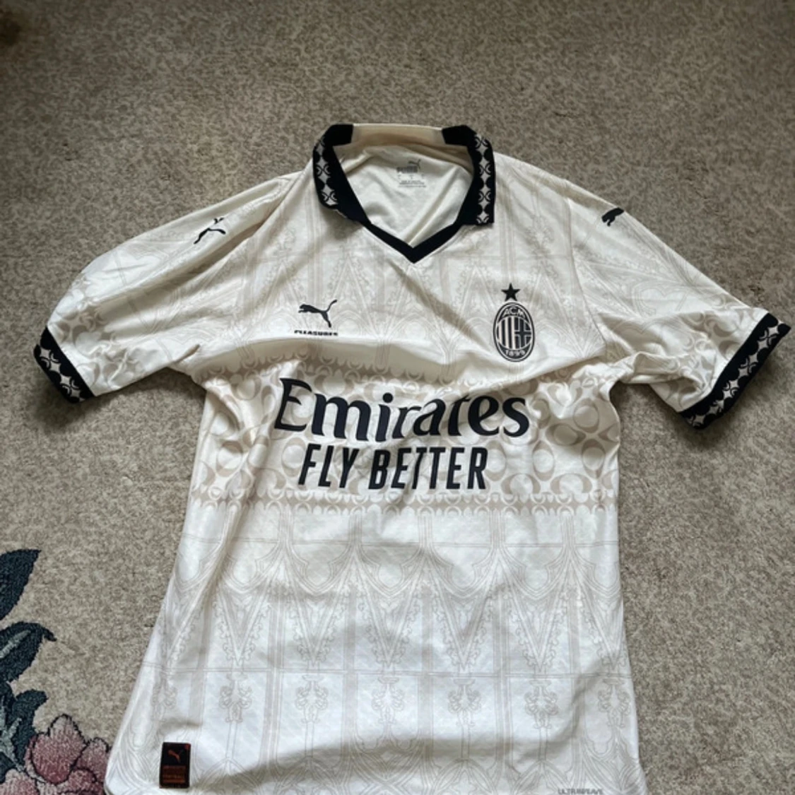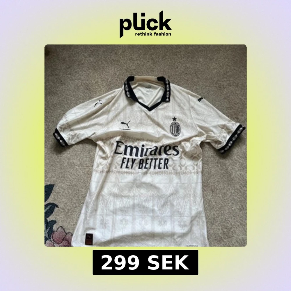 AC Milan x Puma fotbollströja i vitt med subtila mönster och svarta detaljer. Klassisk krage med svart mönster, broderade loggor och tryck från Emirates och Pleasures. Tillverkad i lätt och ventilerande material, perfekt för match eller streetwear.