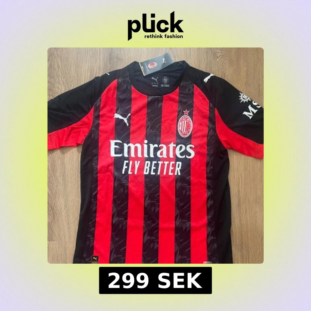 AC Milan matchtröja från Puma med klassiska röda och svarta ränder, klubbmärke på bröstet och sponsortryck framtill. Tillverkad i lätt och ventilerande polyester med DryCell-teknologi. Kortärmad modell med rund hals och snygga detaljer på axlarna. Nya säsongens fotbollströja (2025/2026) i storlek S.