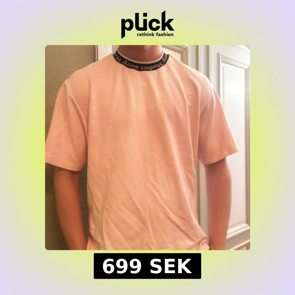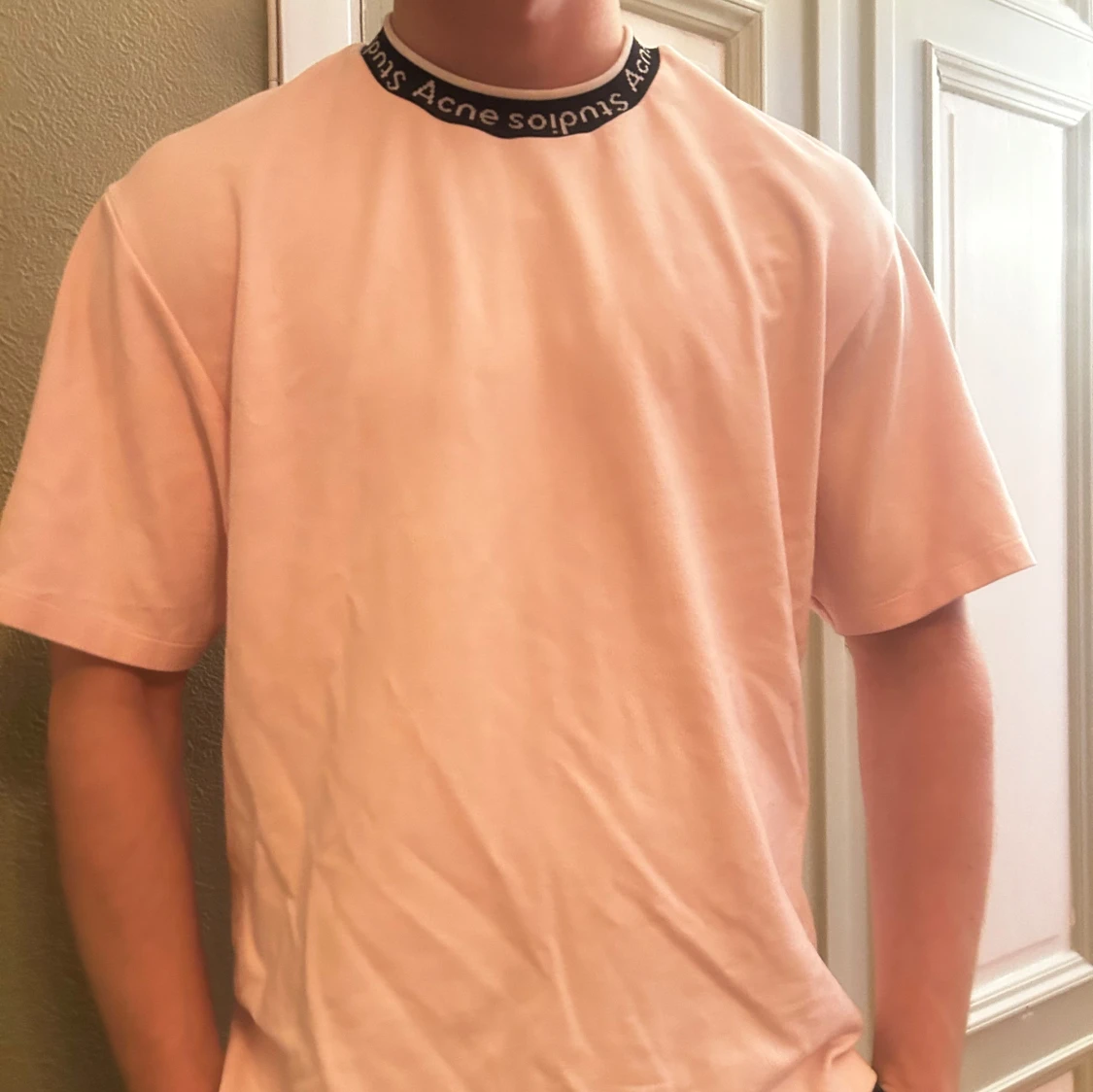 Säljer en stilren rosa t-shirt från Acne Studios med korta ärmar och en svart rundad krage med vit text. Perfekt för en avslappnad look.