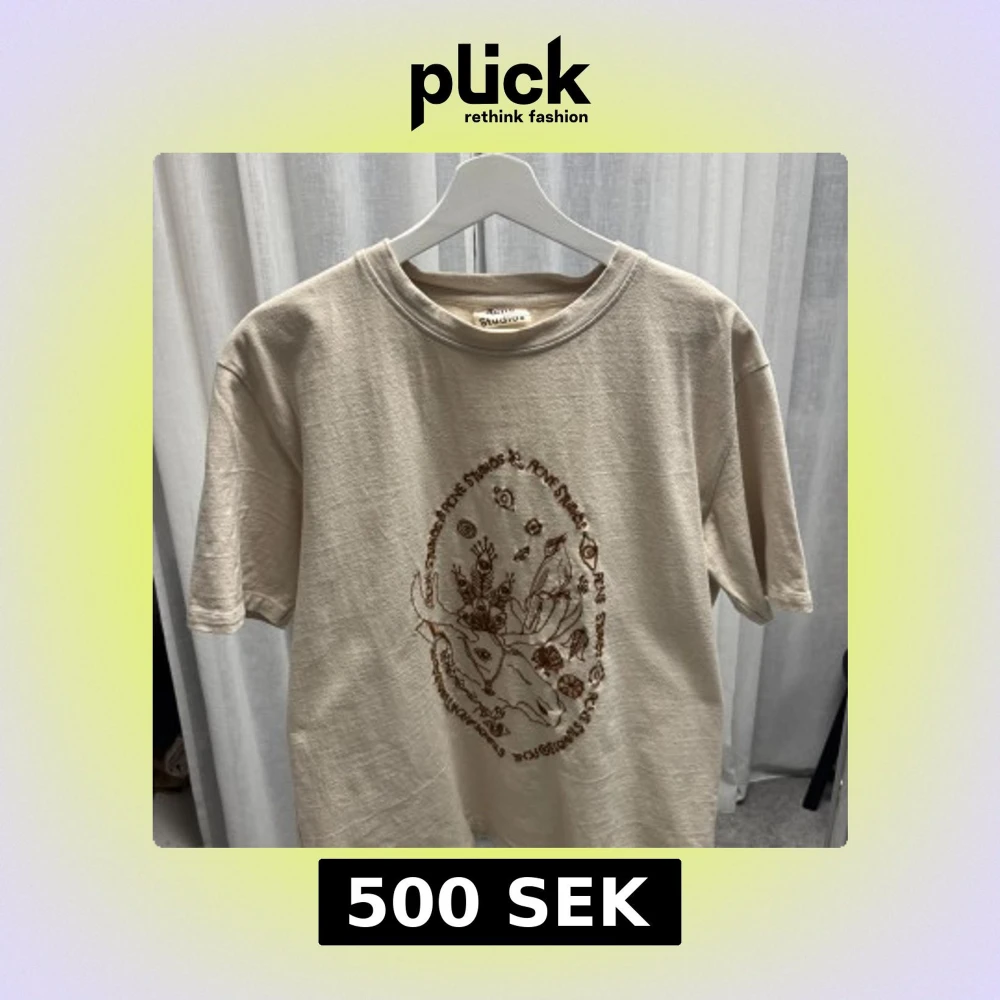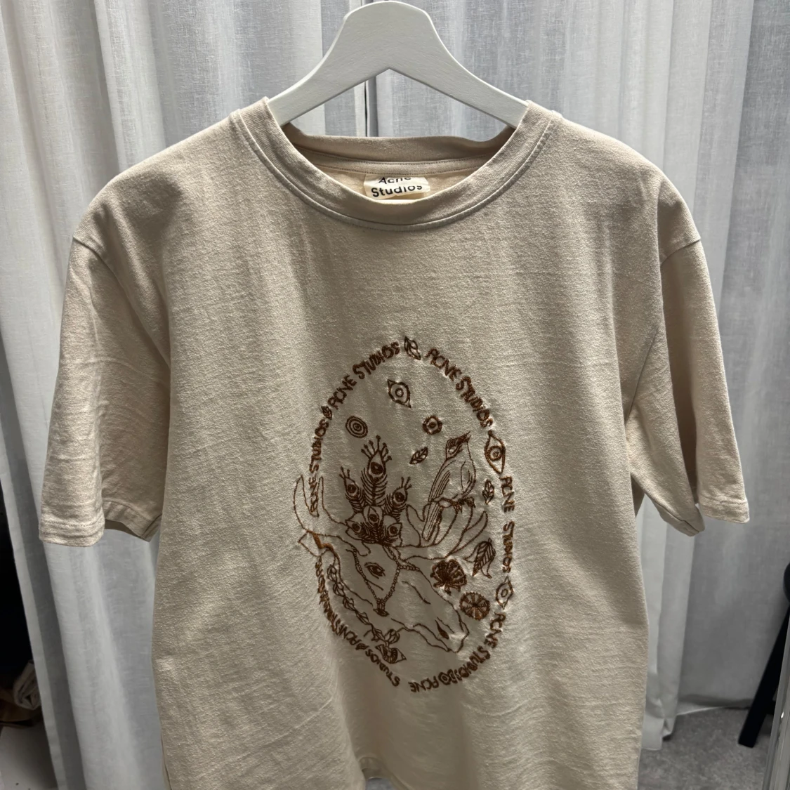 Beige t-shirt från Acne Studios med brunt grafiskt tryck framtill som föreställer ett hjorthuvud och blommor. Klassisk rund hals och korta ärmar. Skön och avslappnad passform i mjuk bomull.
