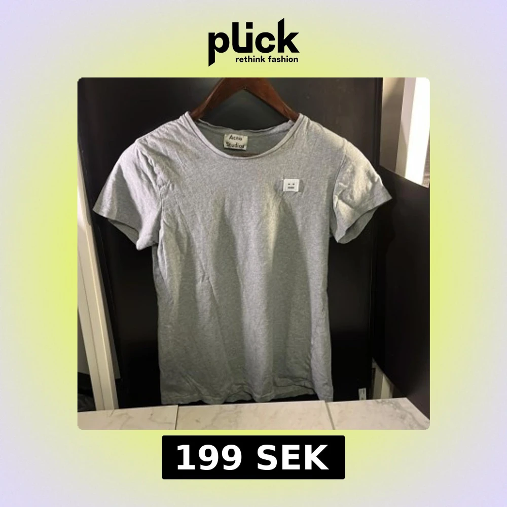 Säljer en stilren grå t-shirt från Acne Studios. Den har en klassisk rund hals och korta ärmar. Perfekt för en avslappnad look, bra att veta att den sitter lite annorlunda i axlarna. Det finns även defekter som syns på bild nr.4, hör av er vid minsta fundering🙌