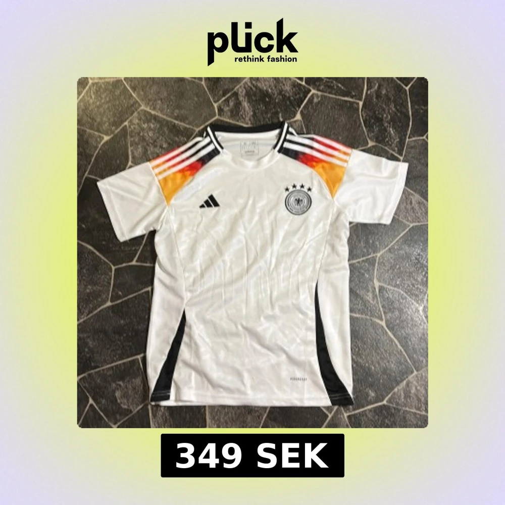 Säljer en officiell Tysklands fotbollströja från Adidas i storlek L. Tröjan är vit med svarta, röda och gula detaljer på axlarna, samt svarta ränder och emblem på bröstet. Materialet är lätt och andas, Aeroready-teknologi. Klassisk rund hals och korta ärmar.