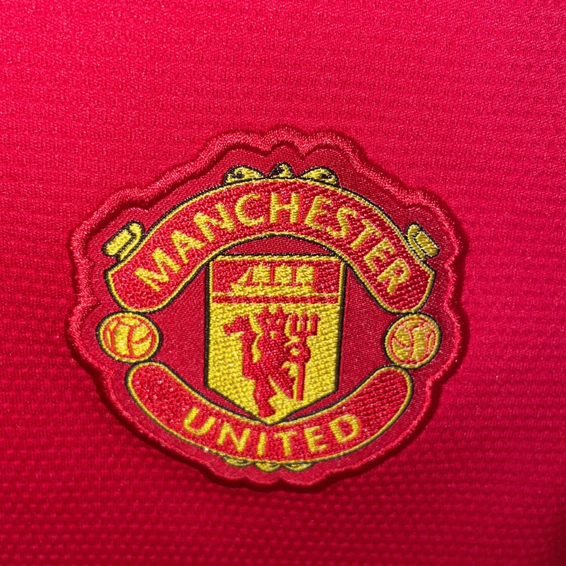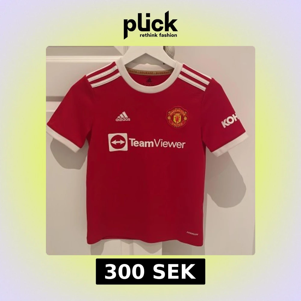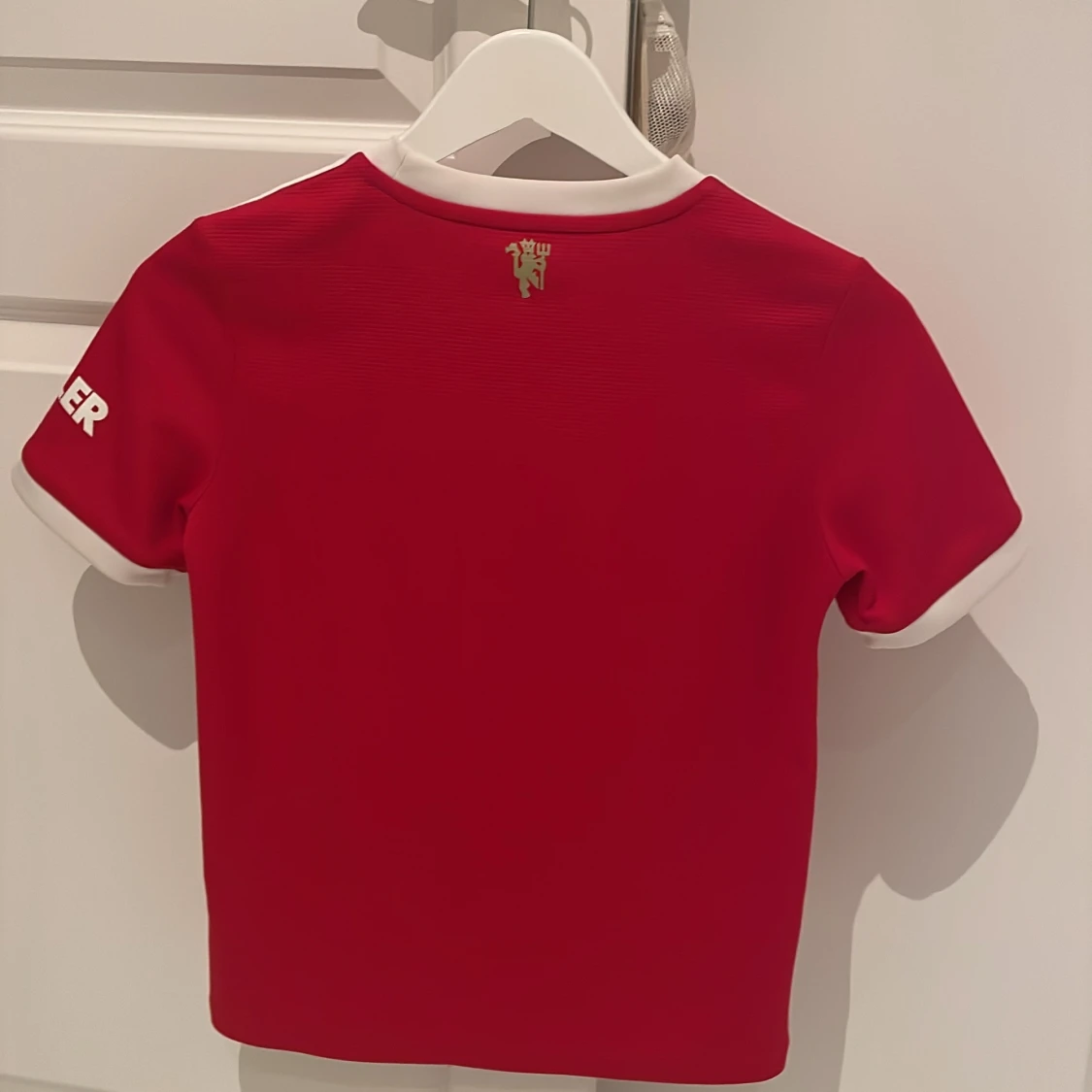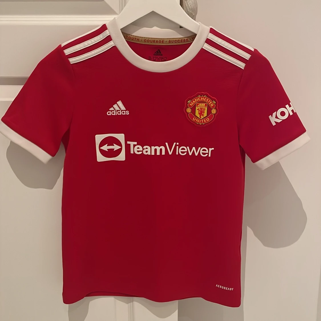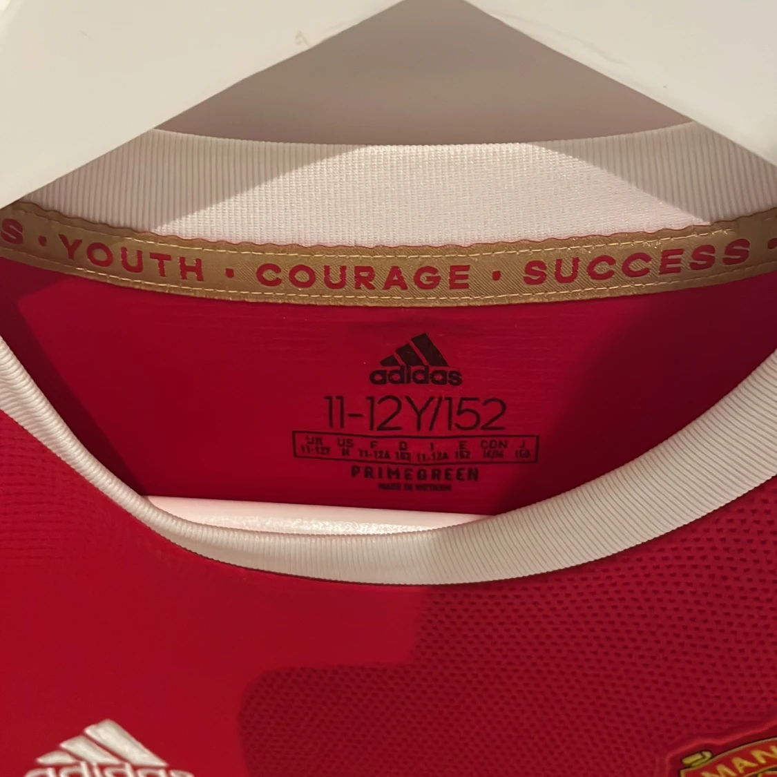 Säljer en röd Manchester United fotbollströja från Adidas med korta ärmar och vita detaljer. Tröjan har klubbens emblem på bröstet och sponsorer tryckta på framsidan. Perfekt för unga fans som älskar fotboll och vill stötta sitt lag.