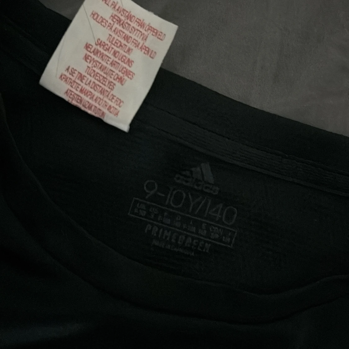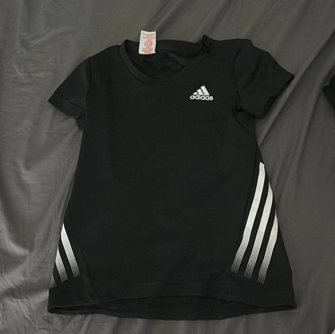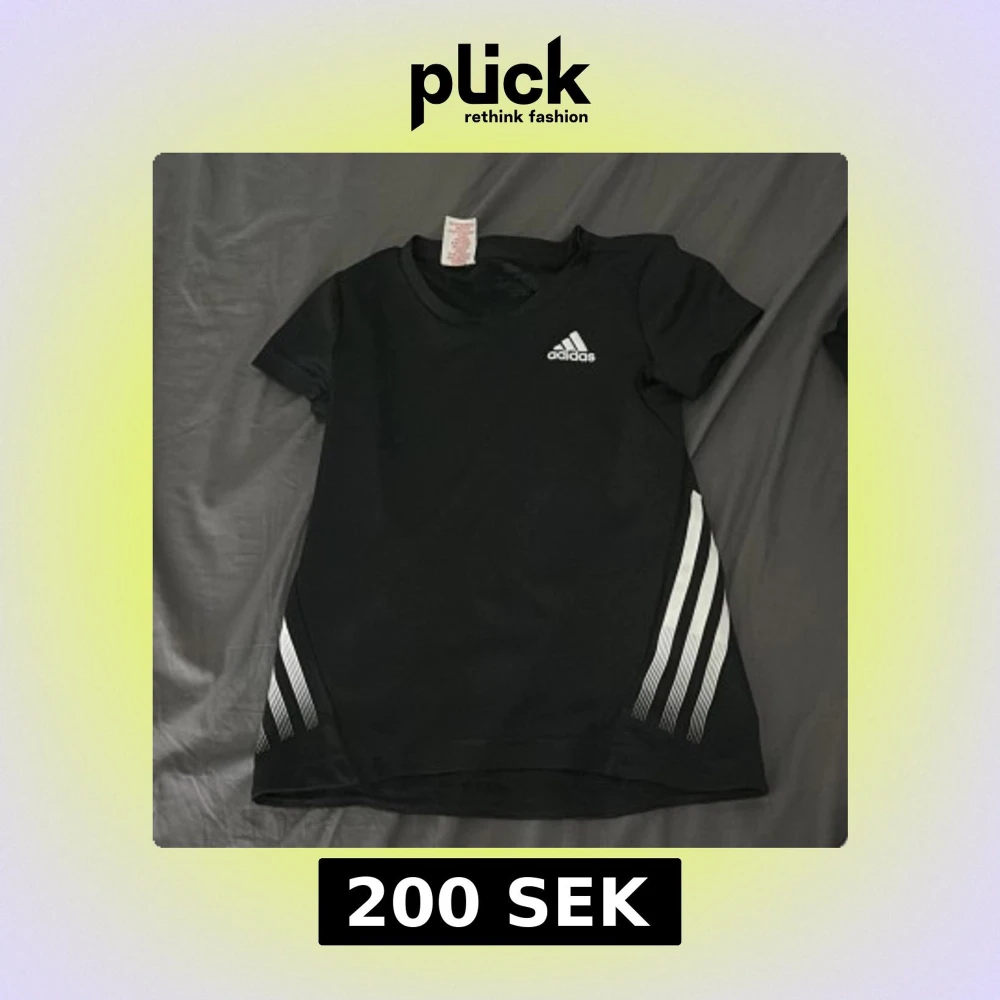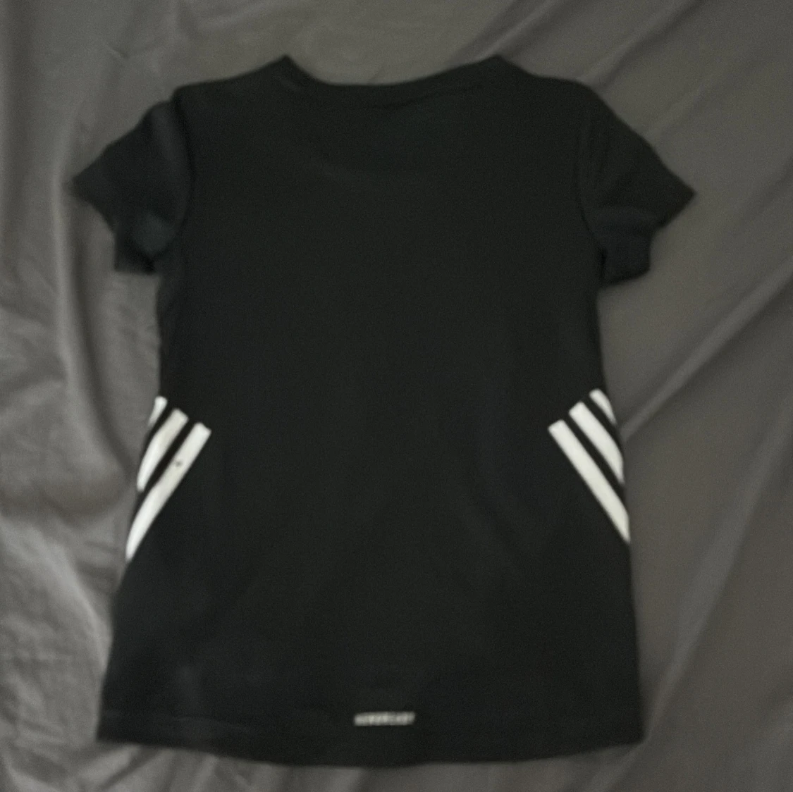 Svart t-shirt från Adidas med klassiska vita ränder på sidorna och Adidas-logga på bröstet. Gjord i mjuk polyester, perfekt för träning eller sport. Kortärmad och med rund hals. Snygg och sportig stil som alltid funkar.