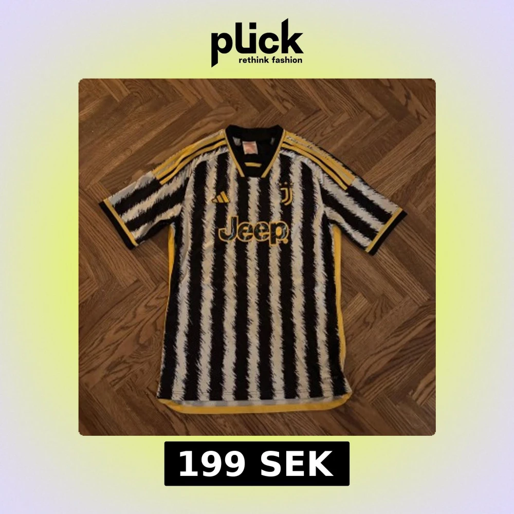 Juventus fotbollströja från Adidas med svart och vit randigt mönster och gula detaljer. Tröjan har klubbmärke med tre stjärnor, Jeep-logga på bröstet och klassiska Adidas-ränder på axlarna.