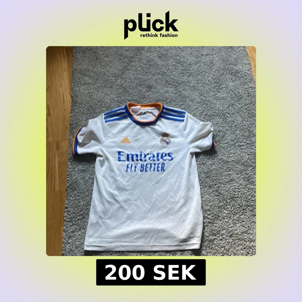 Säljer en officiell Real Madrid fotbollströja från Adidas. Tröjan är vit med blå och orange detaljer på axlar, krage och ärmslut. Klassisk passform med korta ärmar och klubbmärke på bröstet. Materialet är lätt och andas, perfekt för match eller träning.
