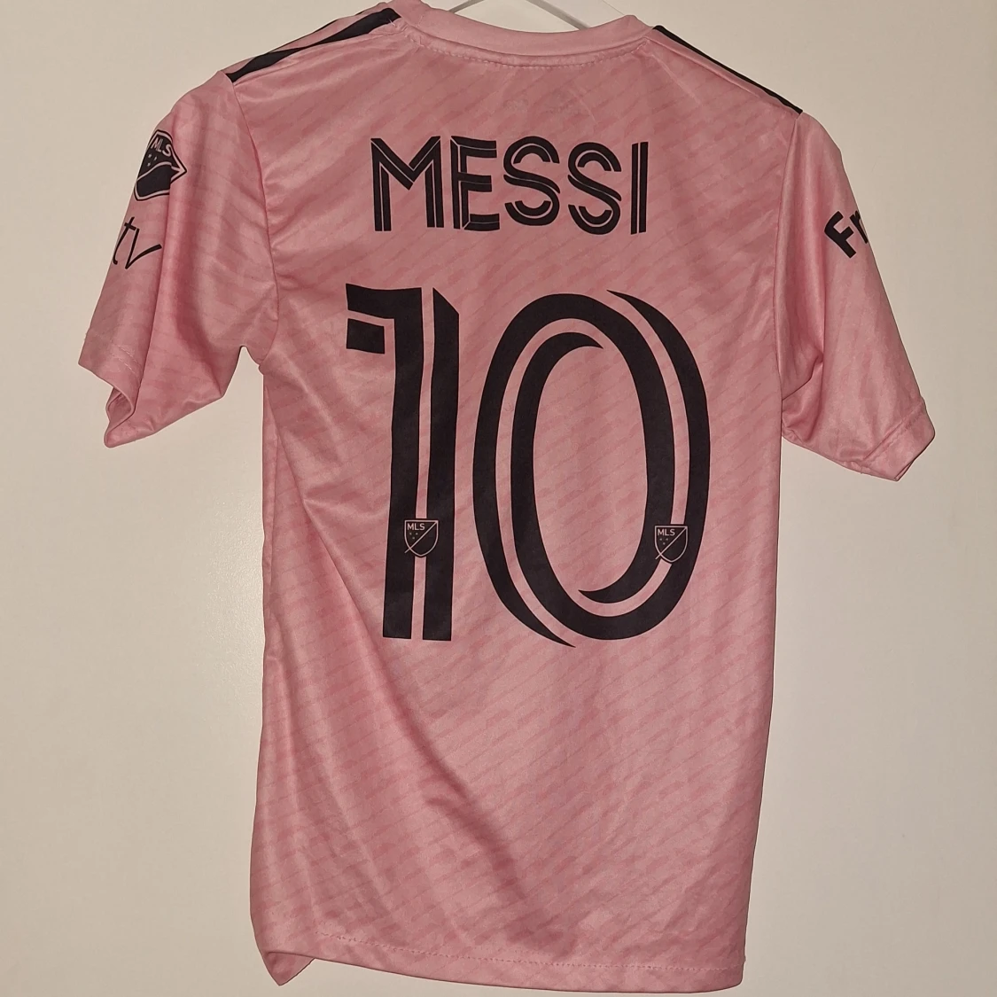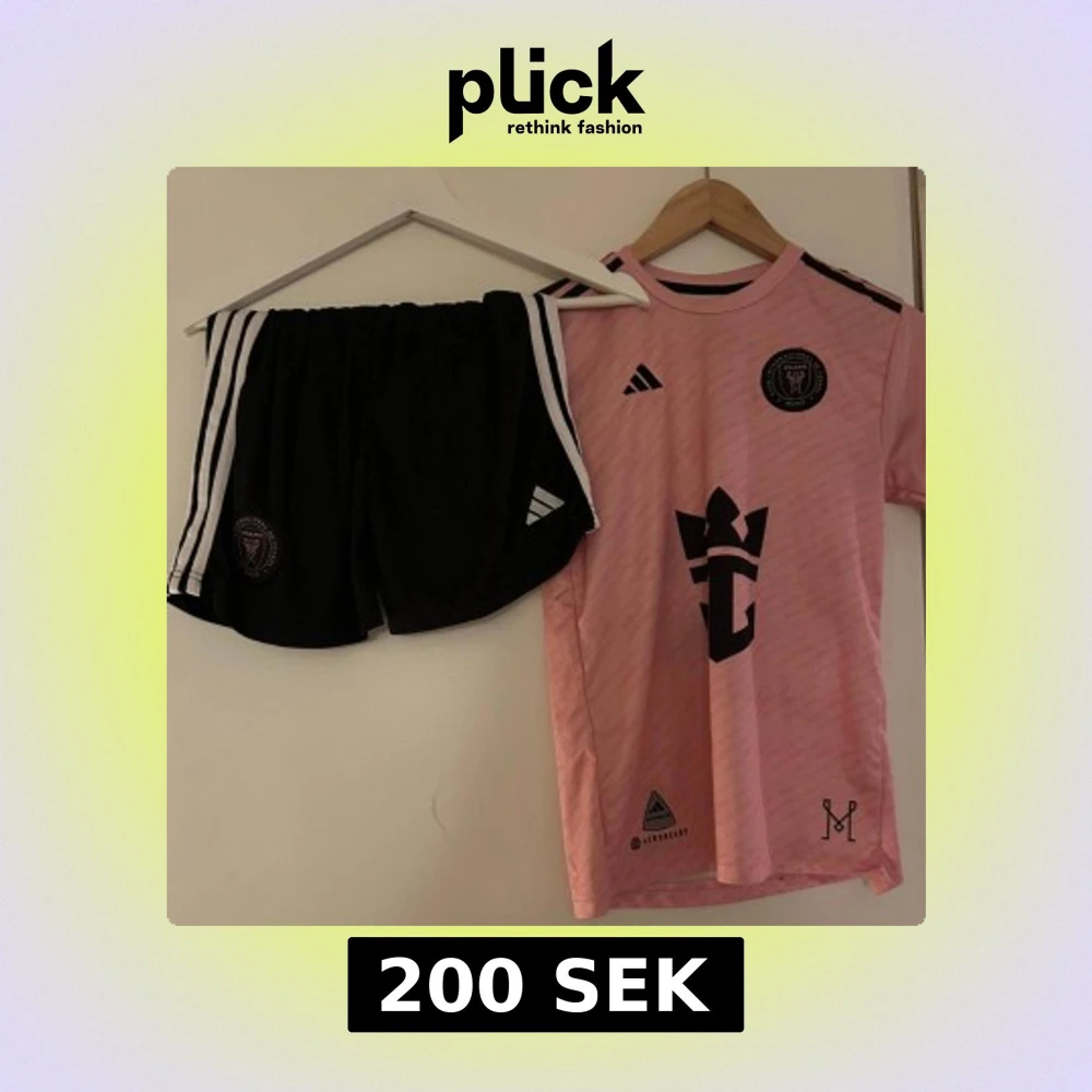 Inter Miami CF fotbollströja från Adidas i ljusrosa med svarta detaljer och Messi 10-tryck på ryggen. Tröjan är kortärmad och tillverkad i lätt funktionsmaterial. Klassiska Adidas-loggor och klubbmärke framtill. Säljes tillsammans med svarta shorts med vita ränder.