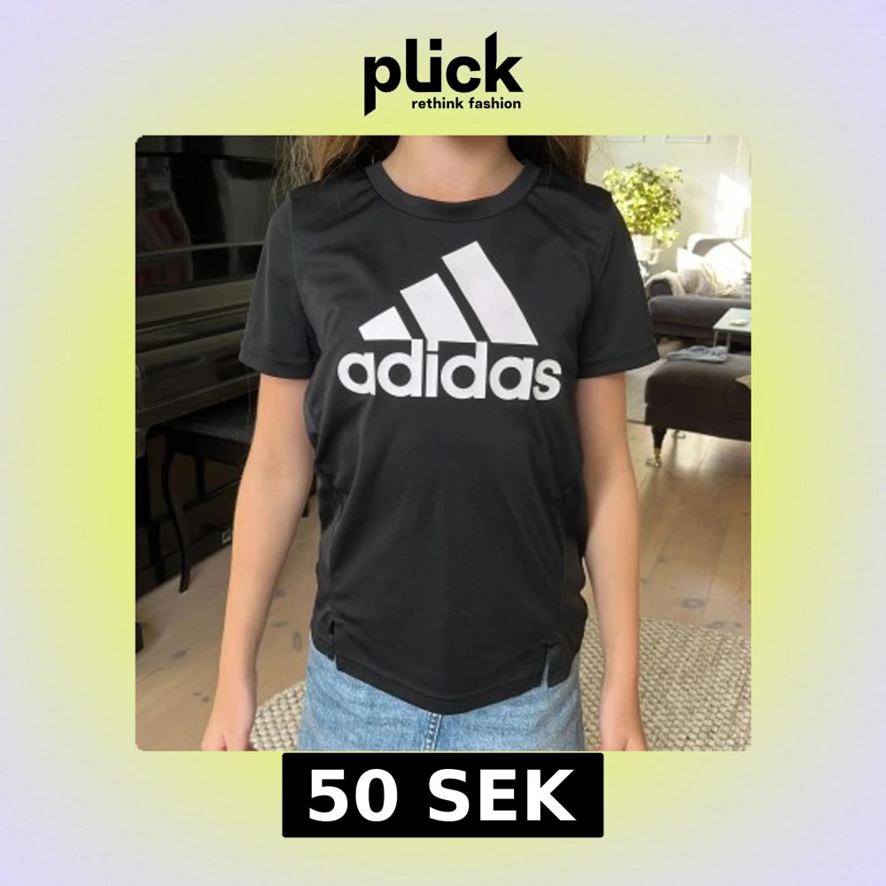 Svart t-shirt från Adidas med stor vit logga framtill. Klassisk rund halsringning och korta ärmar. Tillverkad i ett lätt och sportigt polyestermaterial som andas, perfekt för träning eller chill. Snygg och enkel design som funkar till jeans eller tights.