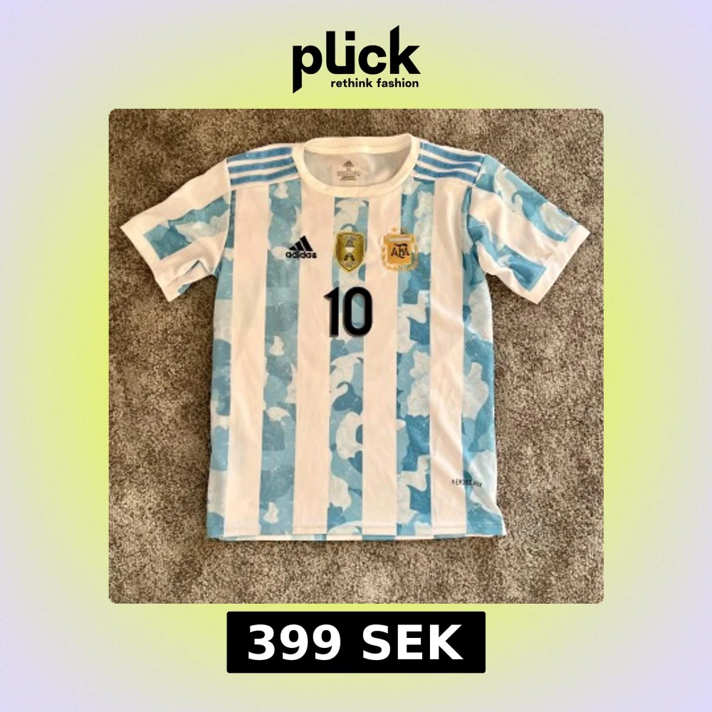 Säljer en officiell Argentina landslagströja från Adidas med Messi och nummer 10 på ryggen. Tröjan har klassiska blå och vita ränder, broderade märken och Copa America 2021-märke. Tillverkad i lätt och ventilerande Aeroready-material, perfekt för fotbollsfans.