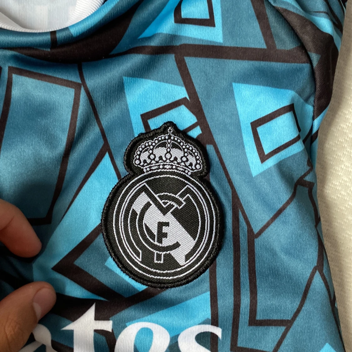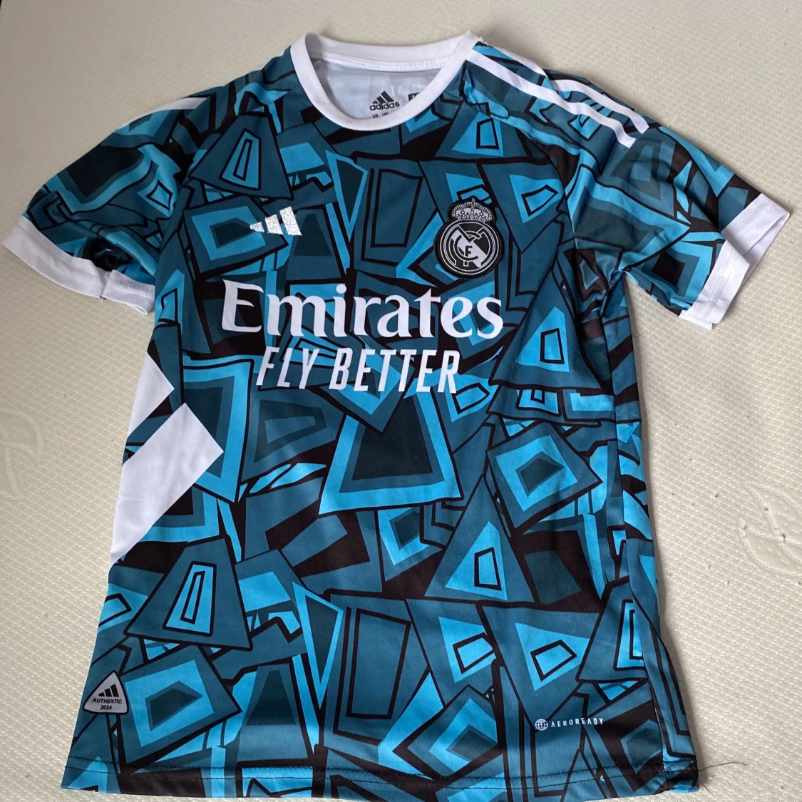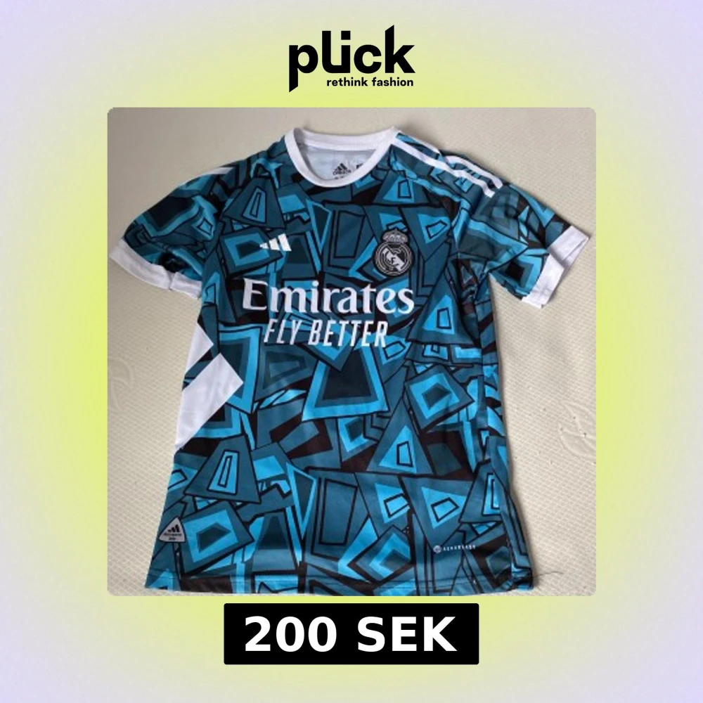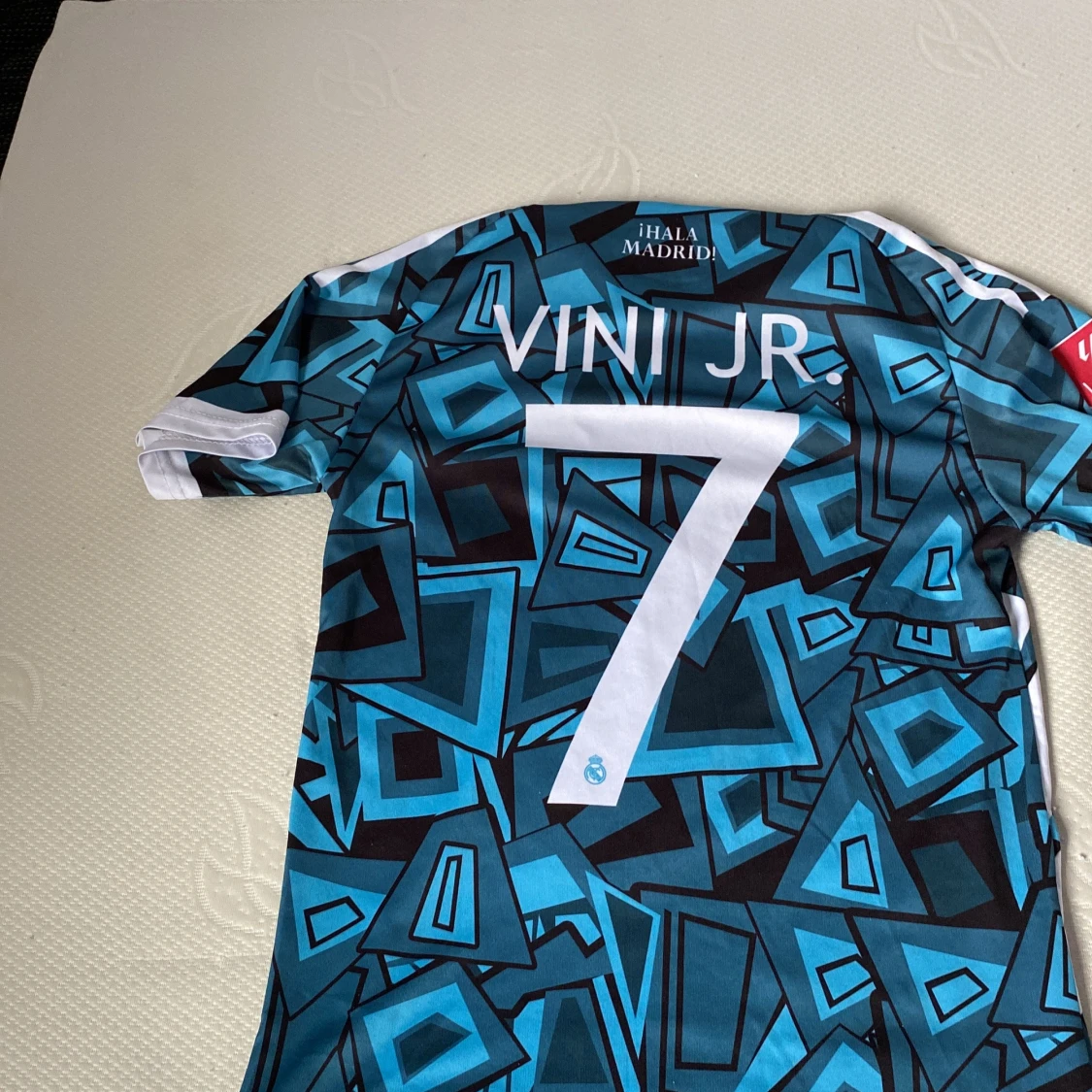 Snygg Real Madrid fotbollströja med VINI JR. och nummer 7 på ryggen. Tröjan har ett unikt blått och svart geometriskt mönster, vita detaljer och klubbmärke på bröstet. Tillverkad i lätt och ventilerande polyester med klassisk Adidas-logga och Aeroready-teknologi.
