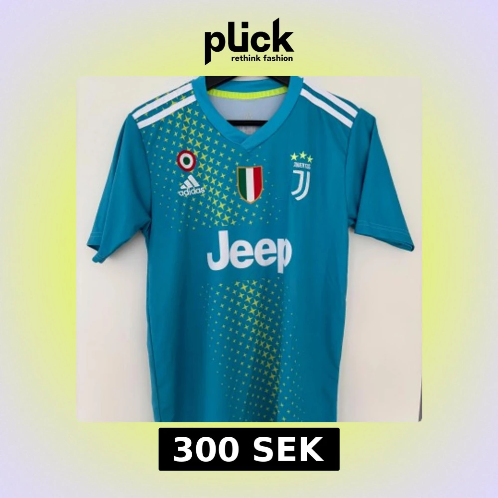 Juventus fotbollströja i blått med vita detaljer, Adidas-logga och Jeep som sponsor. Framsidan har gula stjärnmönster och klubbmärken, baksidan med Ronaldo och nummer 7 i vitt. Kortärmad, V-ringad och tillverkad i lätt polyester. Perfekt för fans av Ronaldo och Juventus.