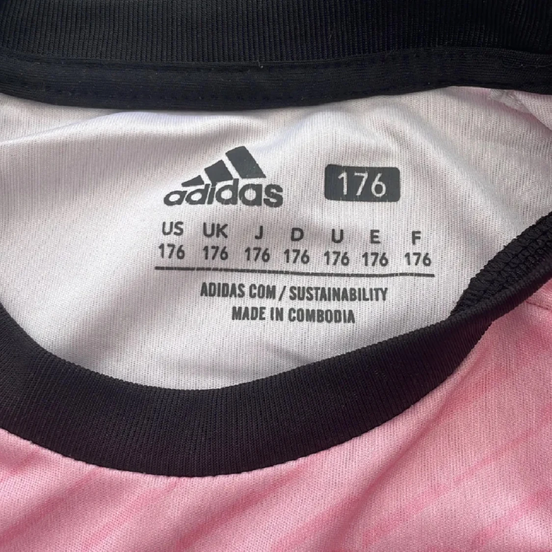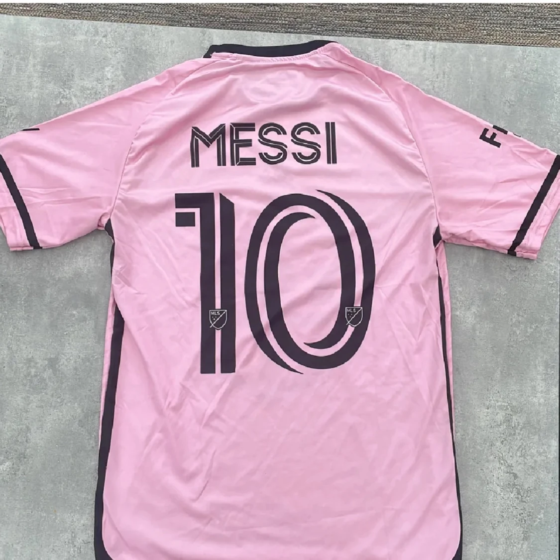 Säljer en rosa Inter Miami fotbollströja från Adidas med Messi och nummer 10 på ryggen. Tröjan har svarta detaljer, klubbmärke på bröstet och stora tryck på både fram- och baksida. Tillverkad i lätt och ventilerande material, perfekt för fotboll eller supporterliv.