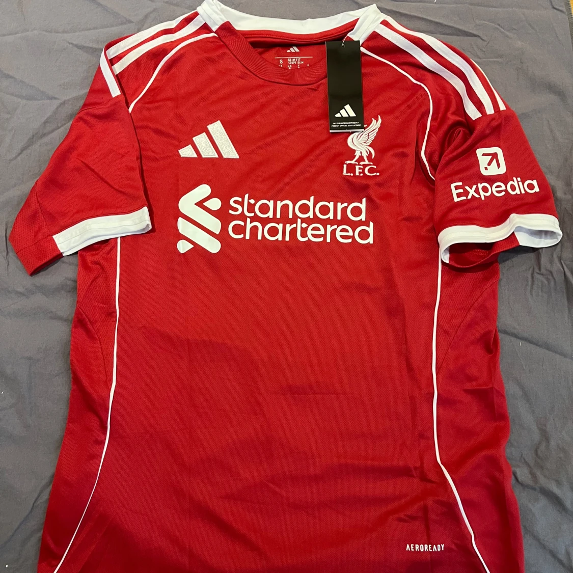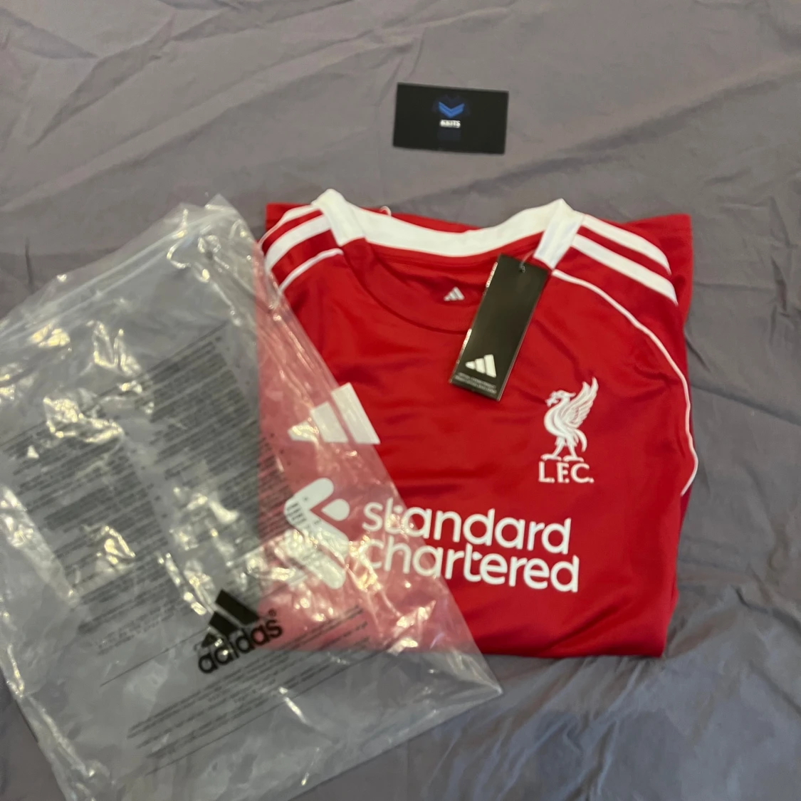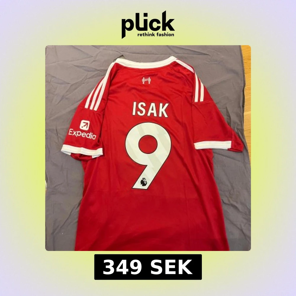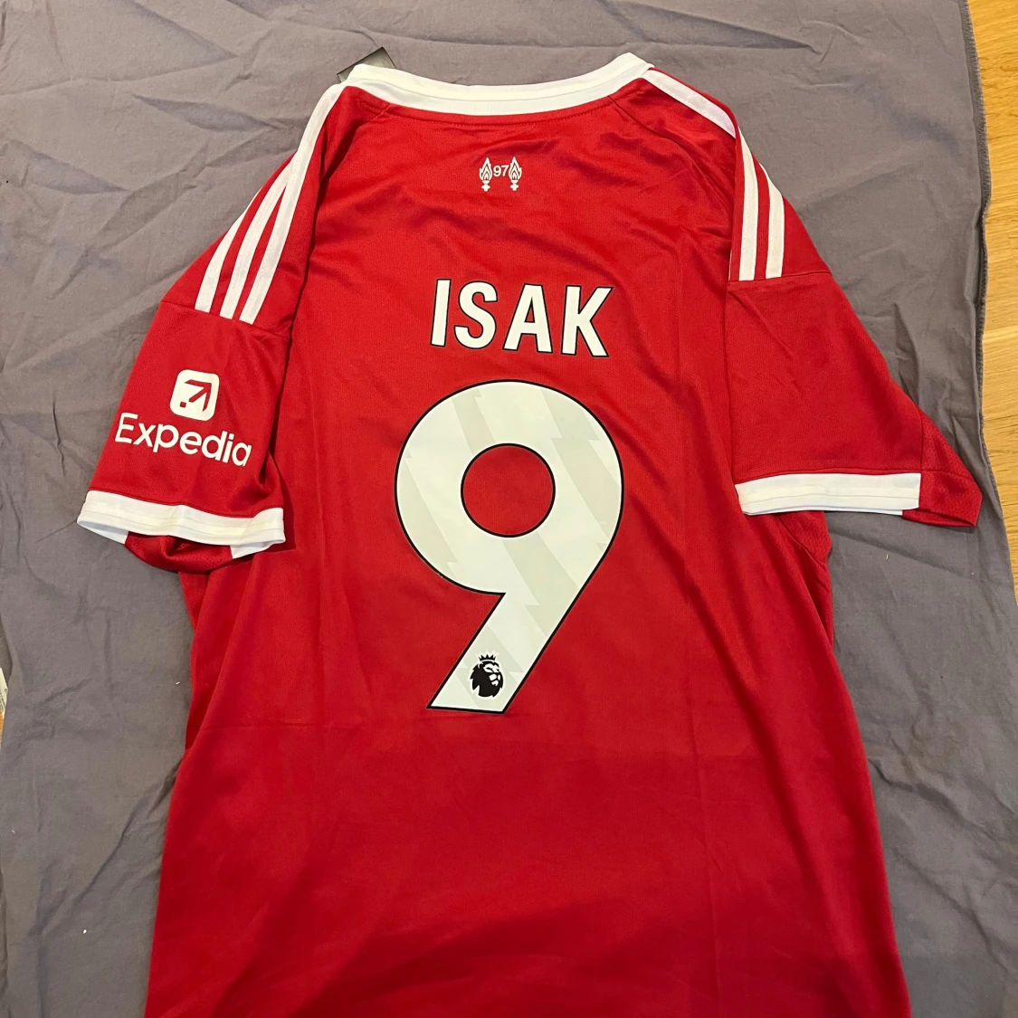 Röd Liverpool fotbollströja från Adidas med vita detaljer och tryck. Nummer 9 och namnet Isak på ryggen, Premier League-logga, Standard Chartered och Expedia som sponsorer. Klassisk passform, kortärmad och tillverkad i lätt funktionsmaterial.