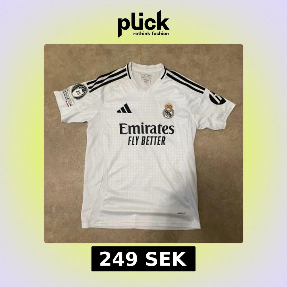 Säljer en vit Real Madrid hemmatröja från Adidas med Vini Jr och nummer 7 på ryggen. Tröjan har korta ärmar, svarta detaljer och klubbmärke broderat på bröstet. Sponsorlogga på framsidan och Champions League-märke på ärmen. Den är nästan äkta