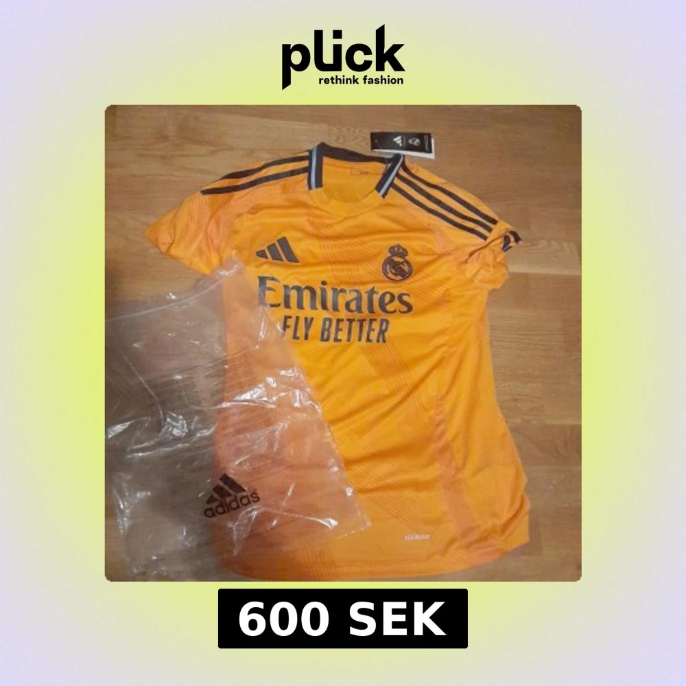 Säljer en orange fotbollströja från Adidas med korta ärmar och svarta detaljer. Tröjan har Real Madrids emblem och sponsorlogga på framsidan samt spelarnamnet 'Mbappé' och nummer 9 på baksidan. Perfekt för fotbollsfans! 🧡 årsmodell 2025 borta