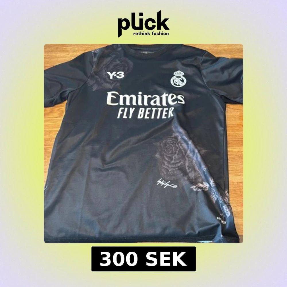 Säljer en svart Real Madrid fotbollströja från Adidas Y-3 kollektionen med ros-mönster och vita tryck. Tröjan har korta ärmar, klubbmärke på bröstet och 'Emirates Fly Better' sponsortryck. Perfekt för dig som vill sticka ut på planen.