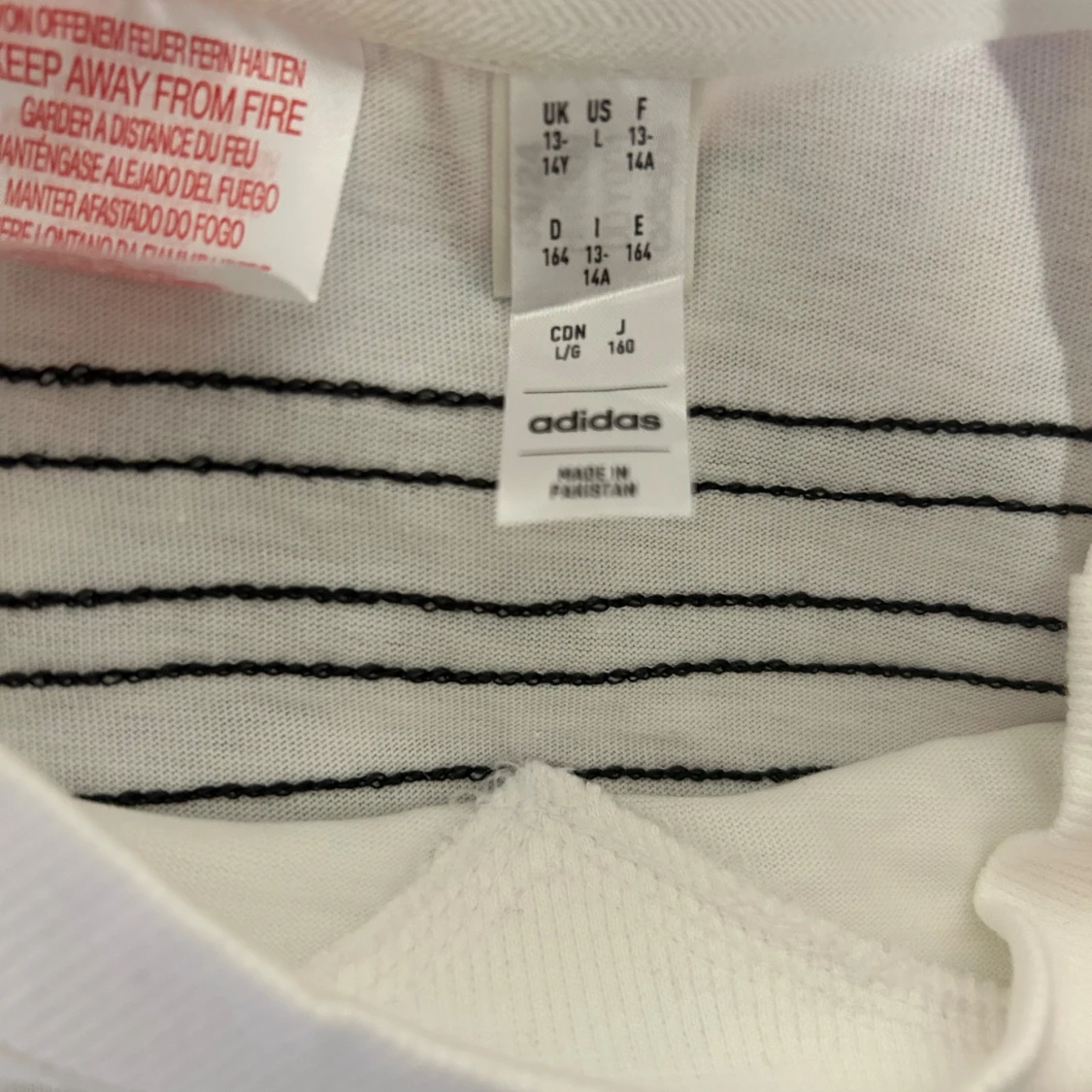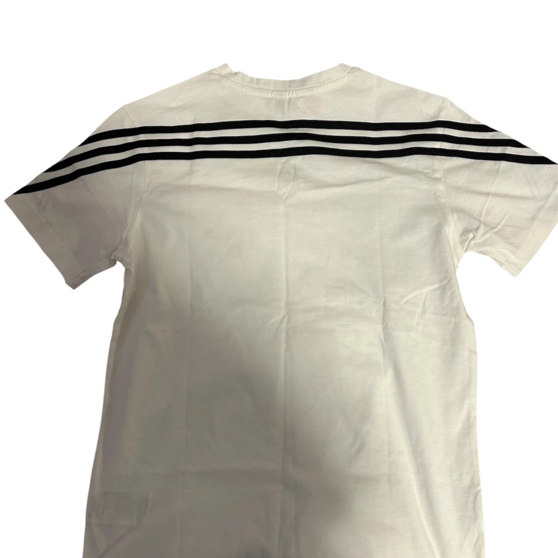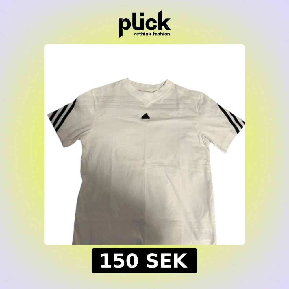 Vit t-shirt från Adidas med klassiska svarta ränder på axlar och ärmar. T-shirten har en enkel v-ringning och Adidas-logga framtill. Tillverkad i mjuk bomull och har en normal passform. Perfekt för en sportig och clean look. Till pojkar 13-14 år