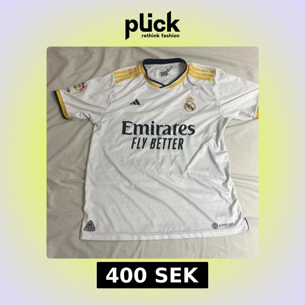 Snygg Real Madrid fotbollströja från Adidas i storlek L. Tröjan är vit med gula och mörkblå detaljer, har korta ärmar och klassiska Adidas-ränder på axlarna. Materialet är lätt och andas, perfekt för match eller träning. Tryck med Emirates Fly Better på bröstet.