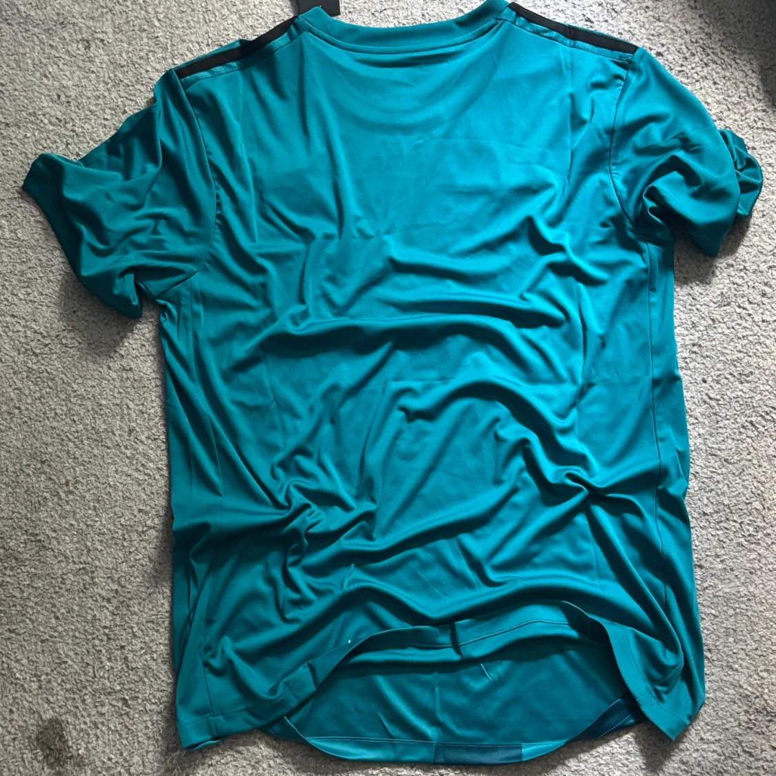 Säljer en blågrön Real Madrid fotbollströja från Adidas med Fly Emirates-tryck och klubbmärke på bröstet. Tröjan har svarta Adidas-ränder på axlarna, korta ärmar och är tillverkad i lätt, ventilerande ClimaCool-material. Perfekt för dig som älskar fotboll och vill sticka ut på planen.