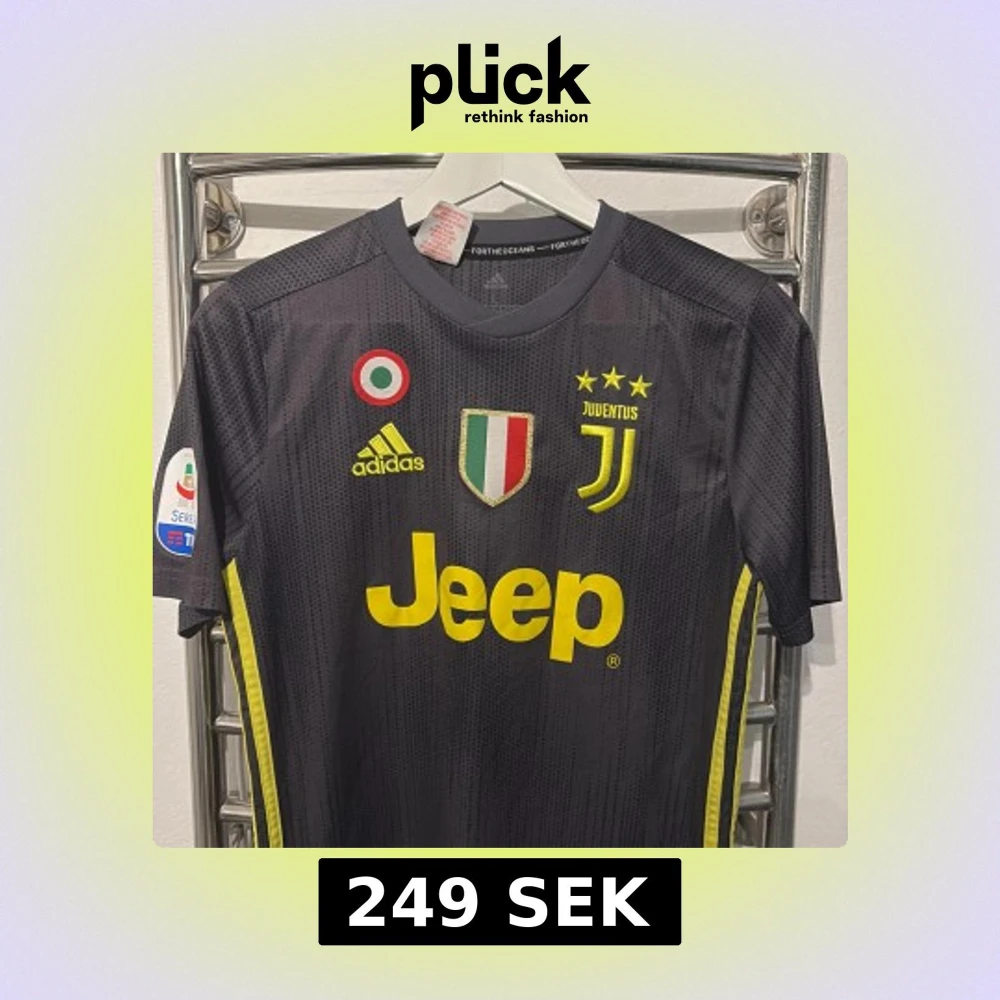 Juventus bortatröja med Ronaldo 7 på ryggen. Svart med gula detaljer, Juventus-logga, tre stjärnor, Adidas-märke och Jeep som sponsor. Korta ärmar och tillverkad i lätt, ventilerande material. Perfekt för dig som älskar fotboll och vill sticka ut på planen.