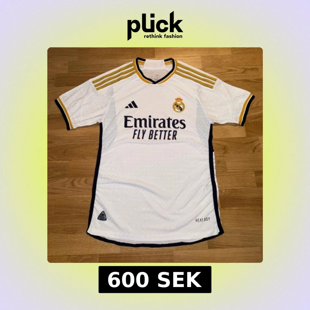 Säljer en officiell Real Madrid hemmatröja. Den är äkta och har alla originaldetaljer, inklusive klubbmärke, Adidas-logga och sponsortryck på framsidan. Materialet är Adidas HEAT.RDY, vilket gör den extra lätt, luftig och bekväm. Det är perfekt både till träning, match eller bara som en snygg vardagströja. Storleken är L men modellen är slim fit, så den kan även passa dig som brukar ha M och vill ha den lite mer normal i passform. Skicket är mycket bra då den är knappt använd.
