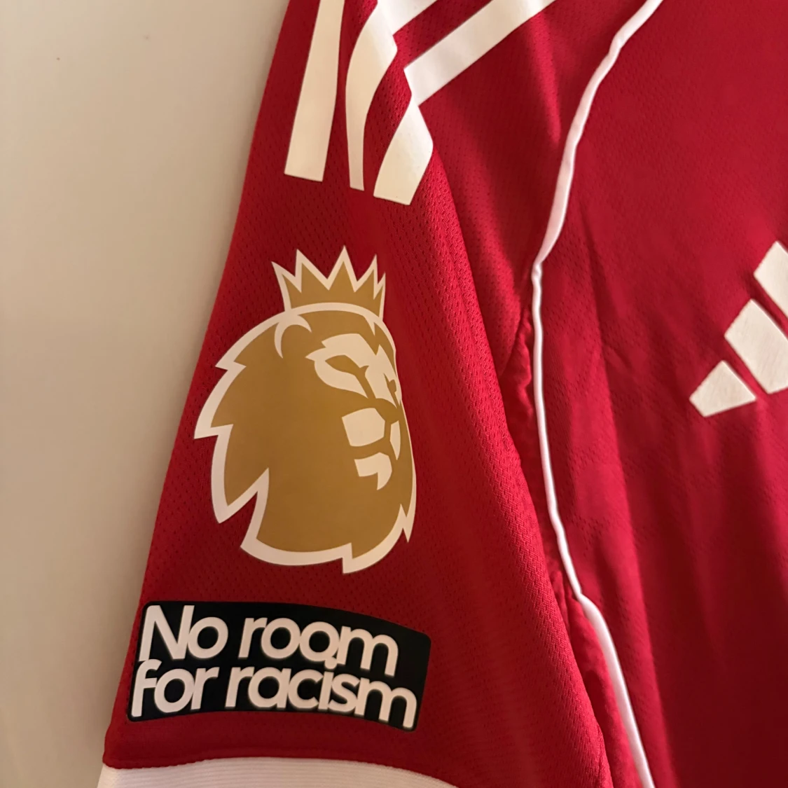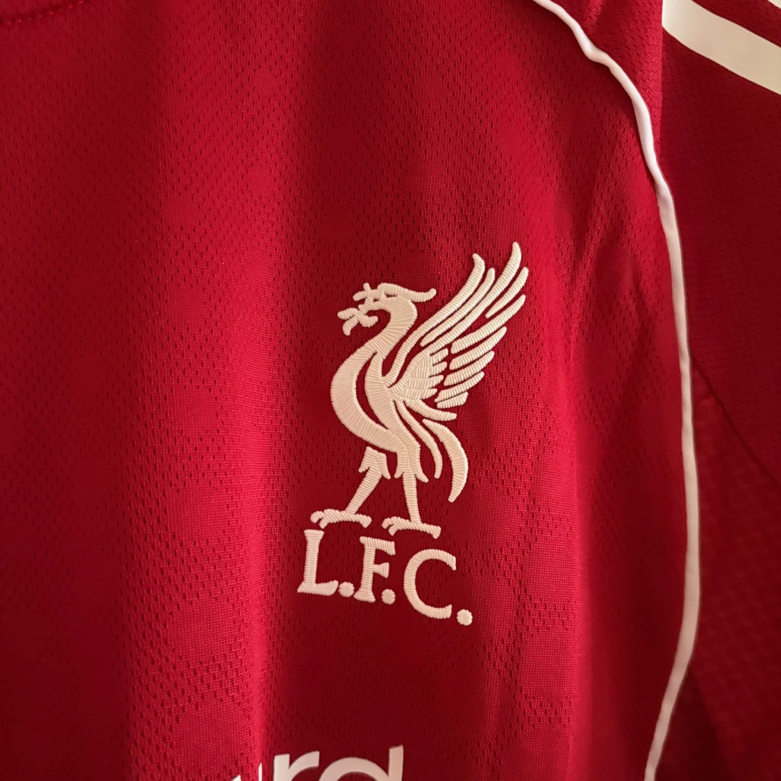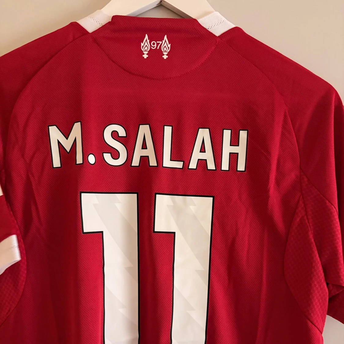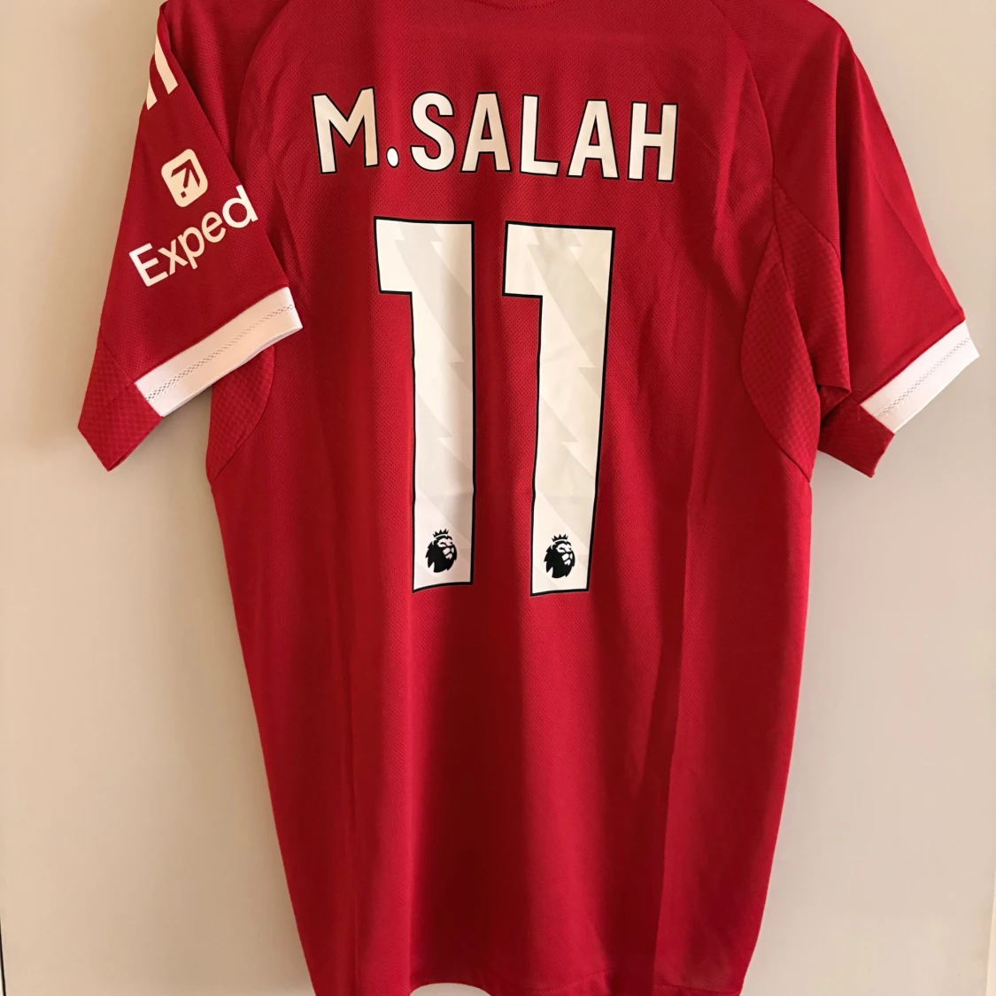 Liverpool FC matchtröja i rött med vita detaljer, Adidas-logga och klubbmärke broderat på bröstet. Nummer 11 och storlek L. Salah på ryggen, Premier League-märke på ärmen. Tillverkad i ventilerande polyester, kortärmad och med klassiska ränder på axlarna.