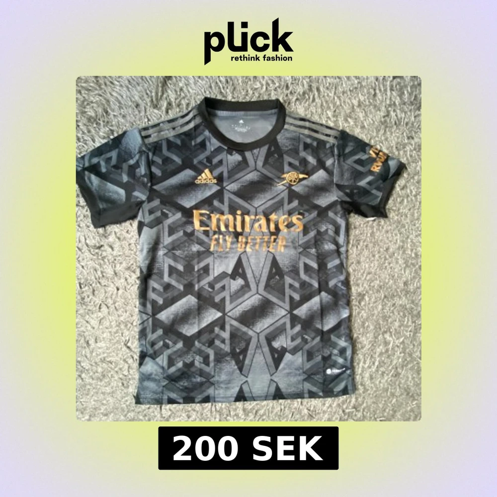 Säljer en svart Arsenal bortatröja från Adidas med guldiga detaljer. Nyskick, aldrig använt. Inga tryck på ryggen. Strl L, passar även M