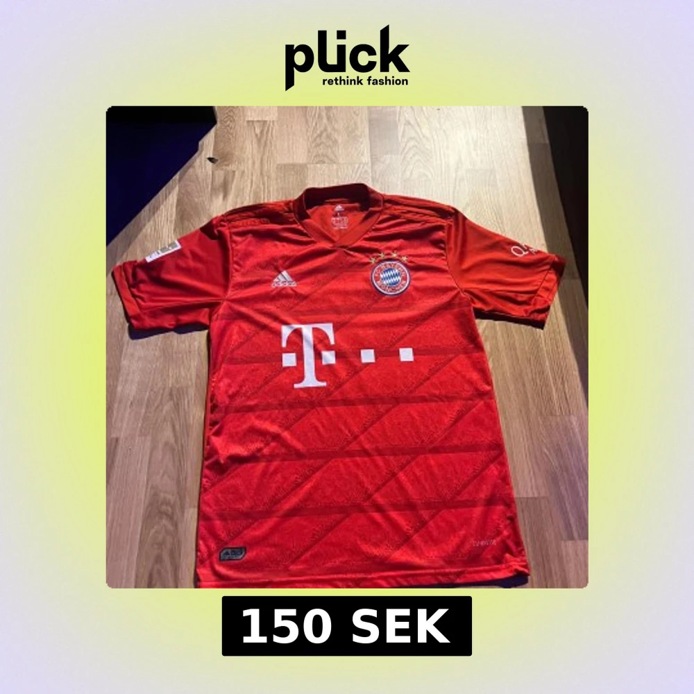 Röd kortärmad Bayern München fotbollströja från Adidas med Lewandowski och nummer 9 på ryggen. Broderat klubbmärke med fyra stjärnor på bröstet och stora vita loggor framtill. Tillverkad i lätt och ventilerande Climalite-material. Väldigt normal i storleken. (Pris kan diskuteras vid snabb affär)