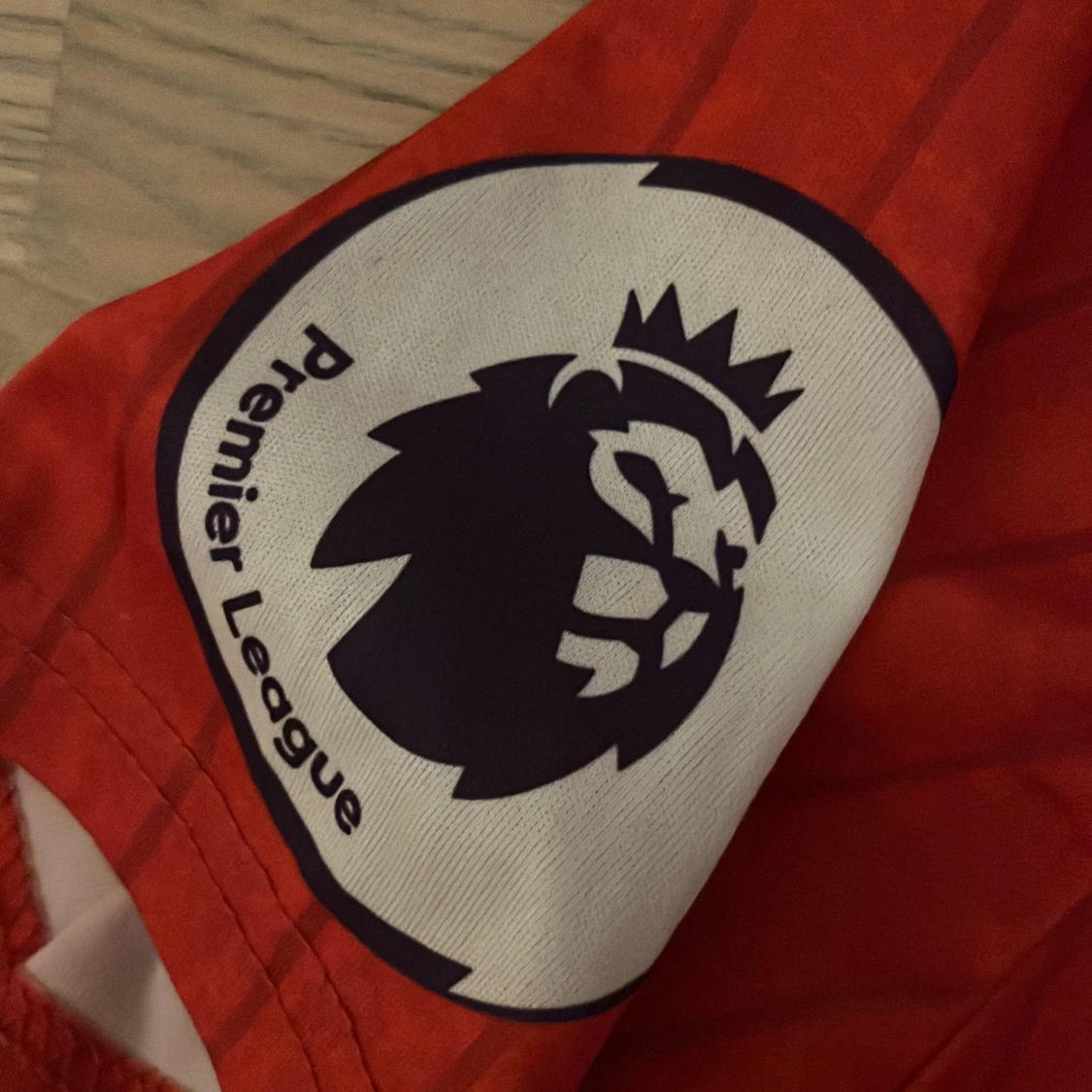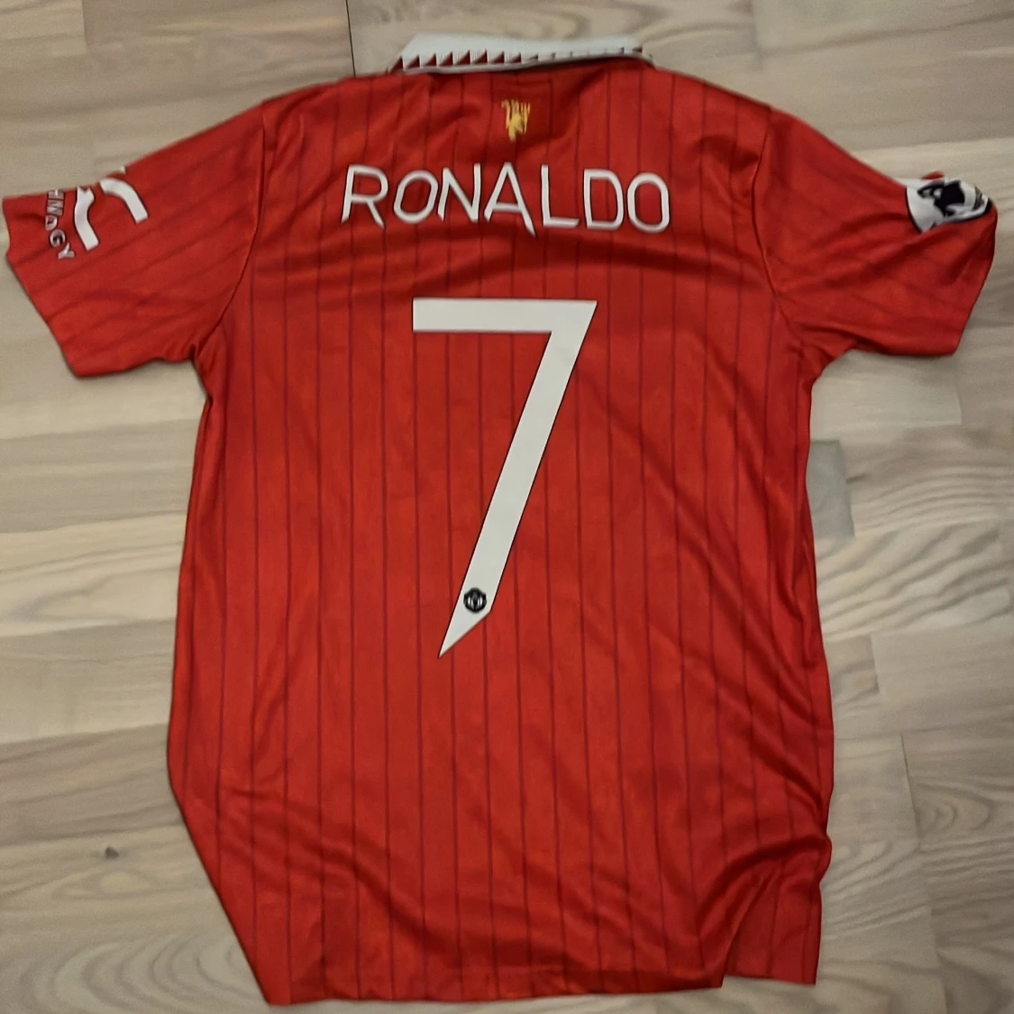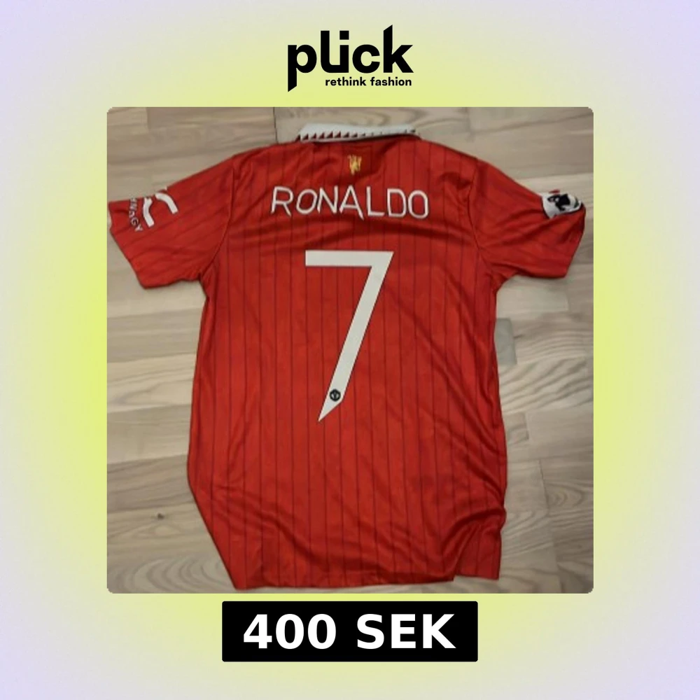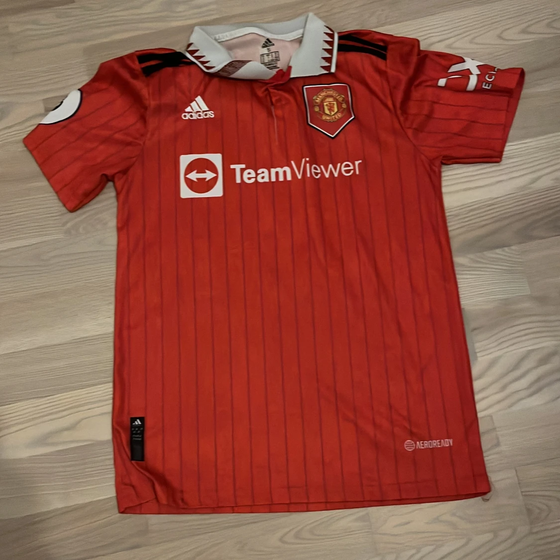 Säljer en röd Manchester United matchtröja från Adidas med Ronaldo 7 på ryggen. Tröjan har vita detaljer, svart och vitt på kragen, samt tunna svarta ränder. Broderad Adidas-logga och klubbmärke framtill, TeamViewer sponsortryck och Premier League-märke på ärmen.