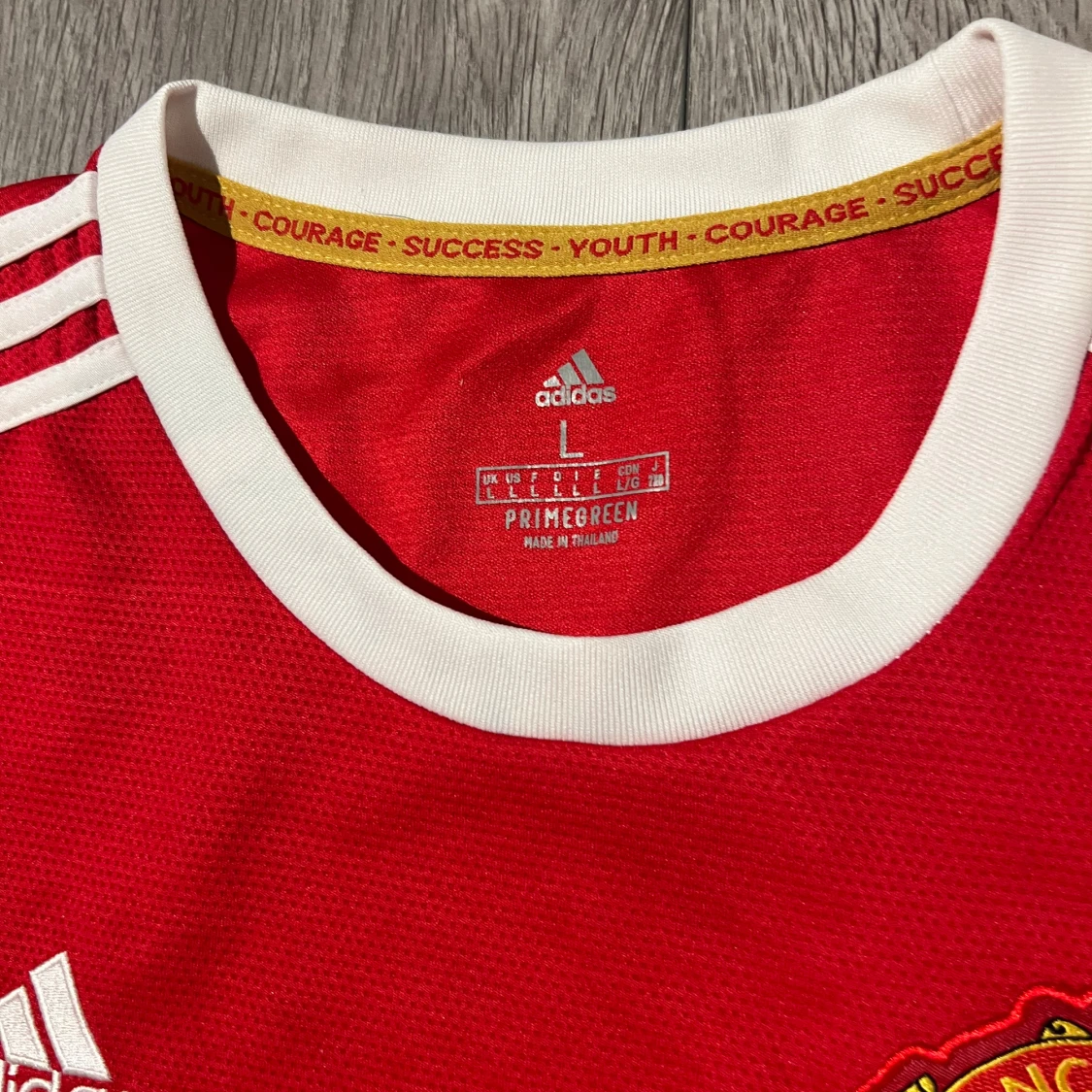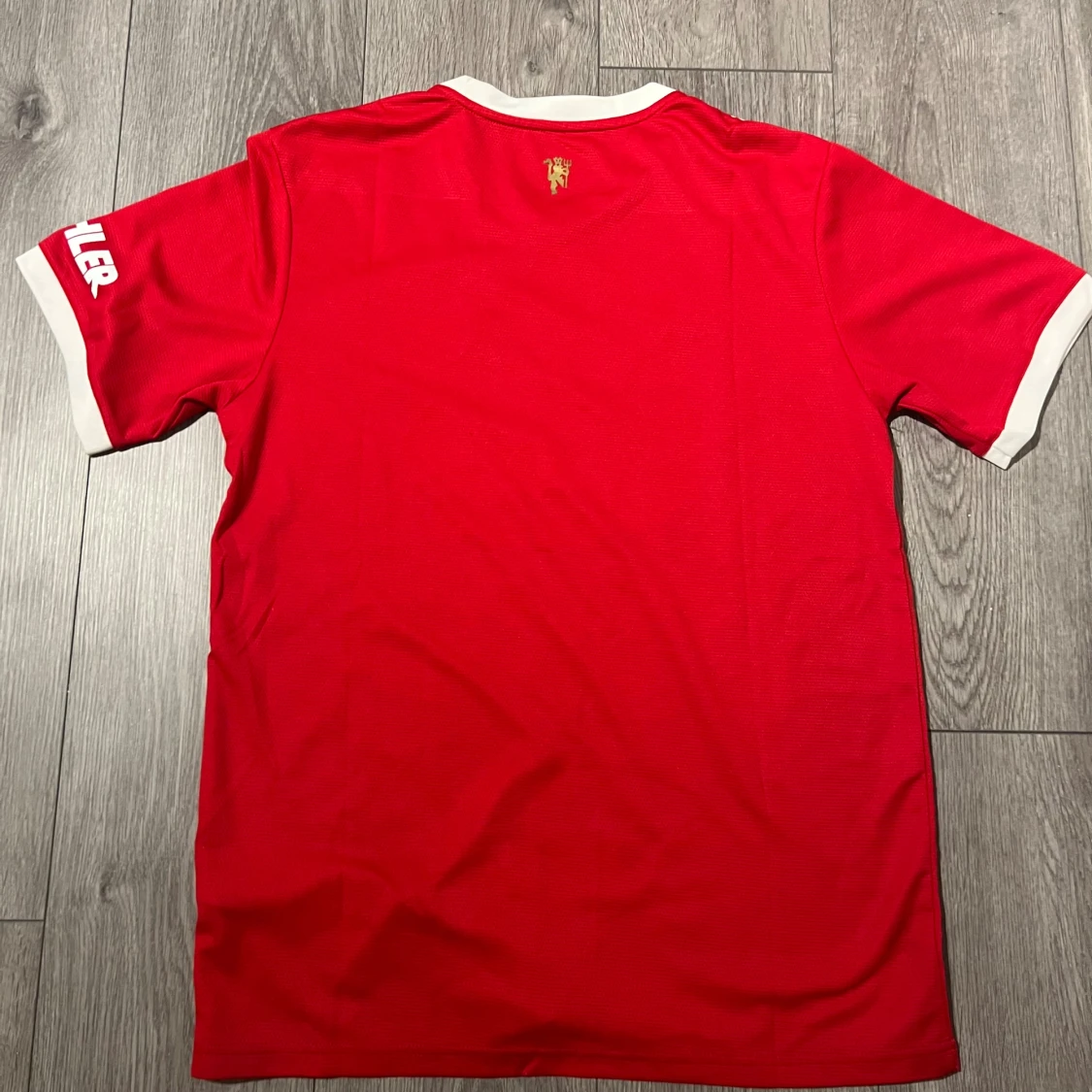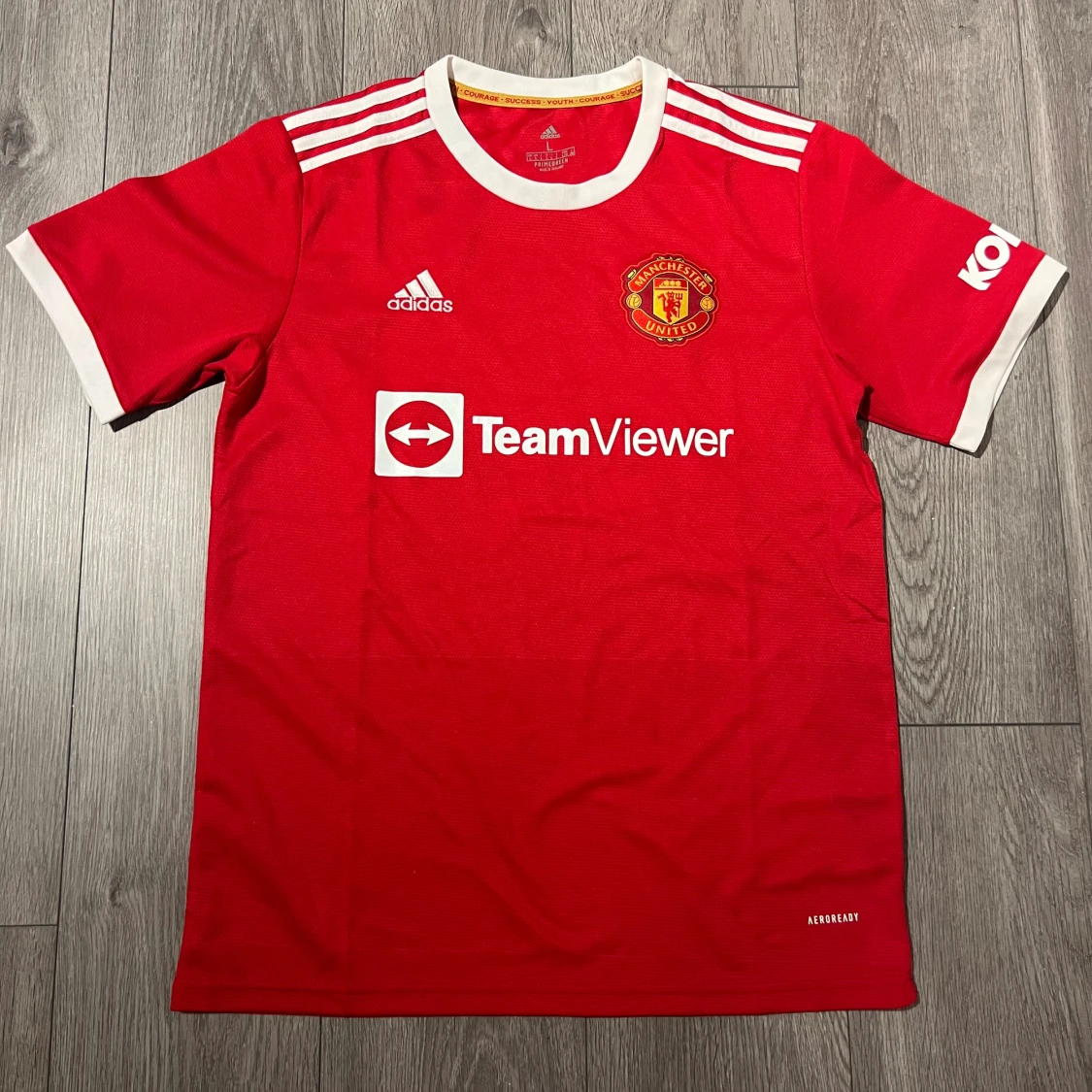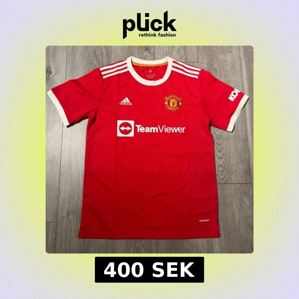 Säljer en officiell Manchester United fotbollströja från Adidas i storlek L. Tröjan är röd med vita detaljer, har korta ärmar och rund hals. Materialet är Primegreen, vilket är ett återvunnet funktionsmaterial. Tryck med TeamViewer och klubbmärke på bröstet.