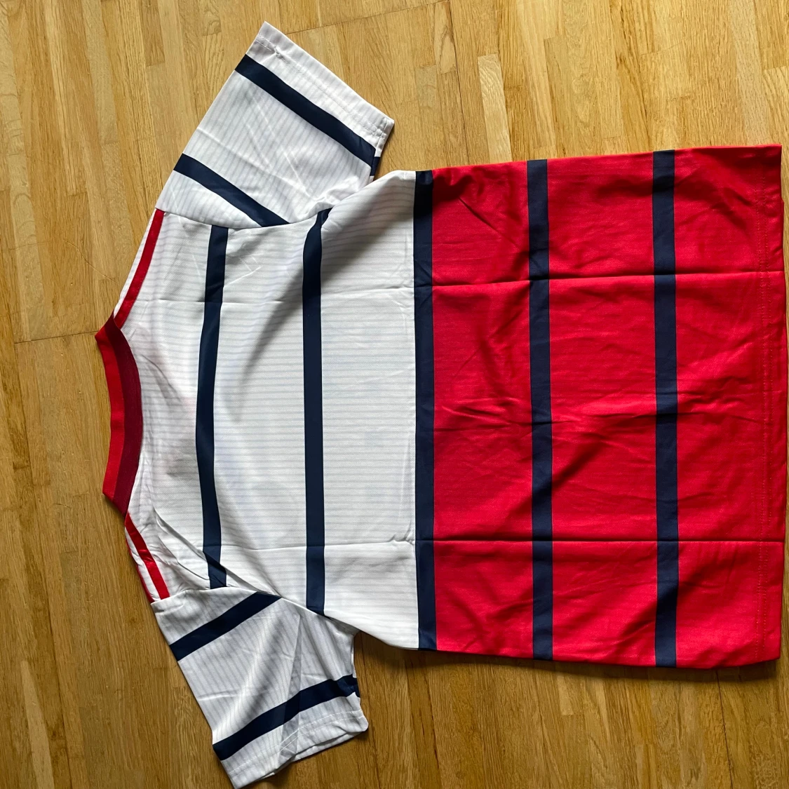 Snygg Bayern München fotbollströja från Adidas med breda röda och vita ränder, mörkblå detaljer och klubbmärke med fyra stjärnor på bröstet. Tröjan har korta ärmar, röd krage och är tillverkad i lätt polyester som andas. Perfekt för dig som älskar fotboll och vill sticka ut.