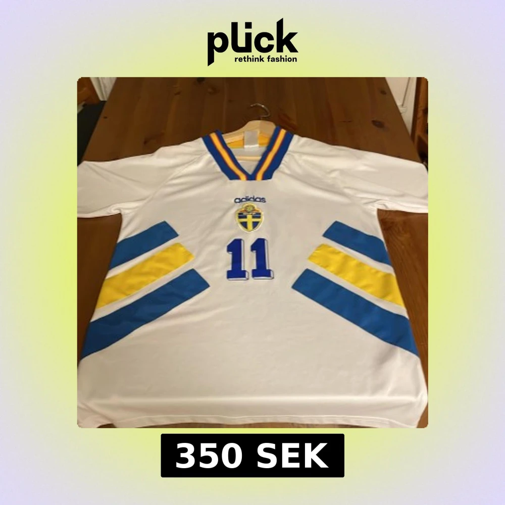 Vit fotbollströja från Adidas med blå och gula detaljer, nummer 11 och Brolin på ryggen. Tröjan har korta ärmar, V-ringad krage med blå och gula ränder samt Sveriges landslagsemblem på bröstet. Materialet är lätt och andas, perfekt för match eller träning.