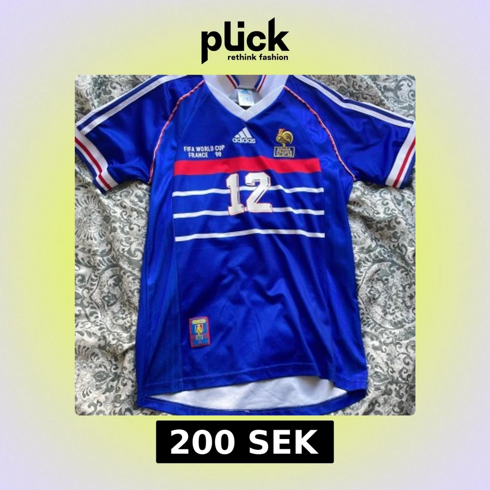 Klassisk blå Frankrike fotbollströja från VM 1998 med Henry och nummer 12 på ryggen. Tröjan har vita och röda detaljer, Adidas-logga och FFF-märke. Kortärmad med randiga inslag och V-ringad krage.