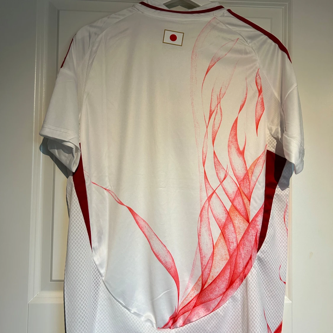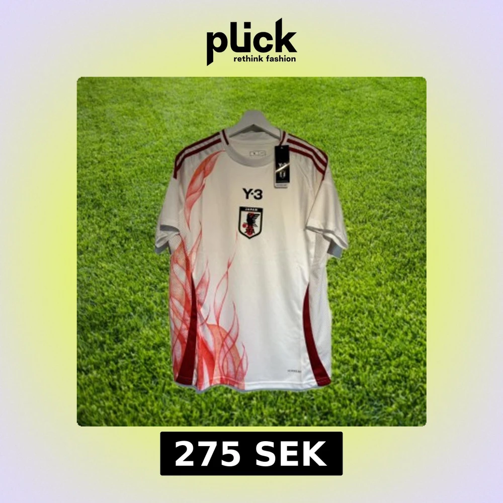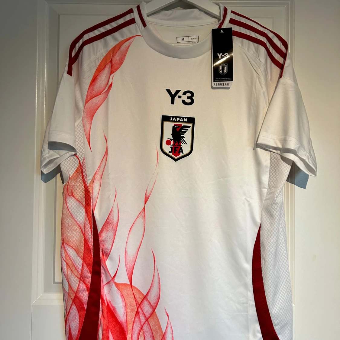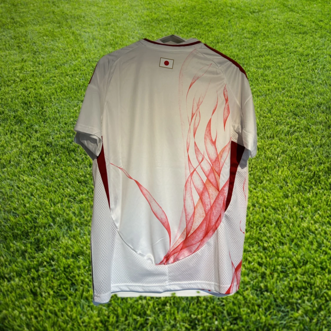 Vit Japan fotbollströja och Y-3 med röda detaljer och flam-mönster. Kortärmad modell med röda ränder på axlarna och Japan-emblem på bröstet. Modern och sportig design.