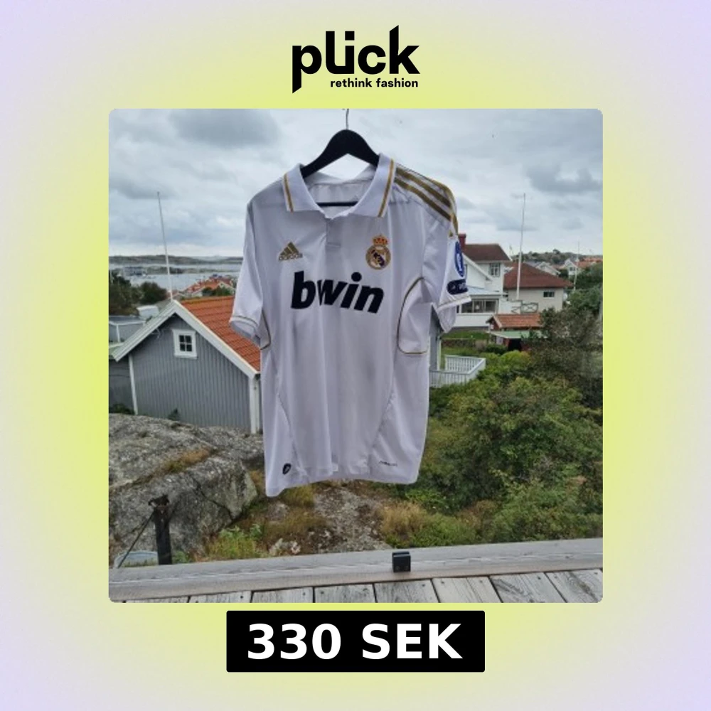 Säljer en officiell Real Madrid fotbollströja från Adidas med Ronaldo 7 på ryggen. Tröjan är vit med guldiga detaljer och svarta tryck, har klubbmärke och sponsorlogga framtill samt Champions League-märke på ärmen. Tillverkad i lätt och ventilerande material.