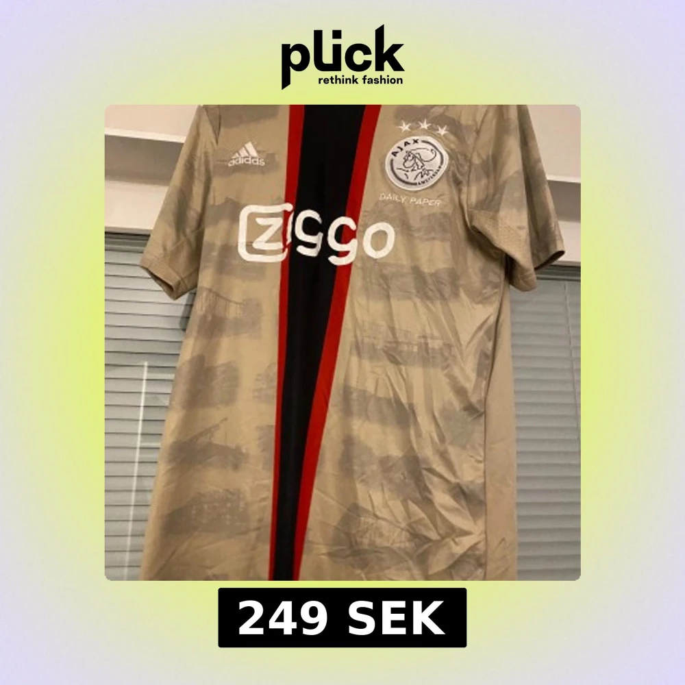 Snygg beige fotbollströja från Adidas med Ajax-logga och sponsortryck. Tröjan har korta ärmar och en unik design med röda och svarta detaljer längs framsidan. Perfekt för fotbollsfans som vill sticka ut.