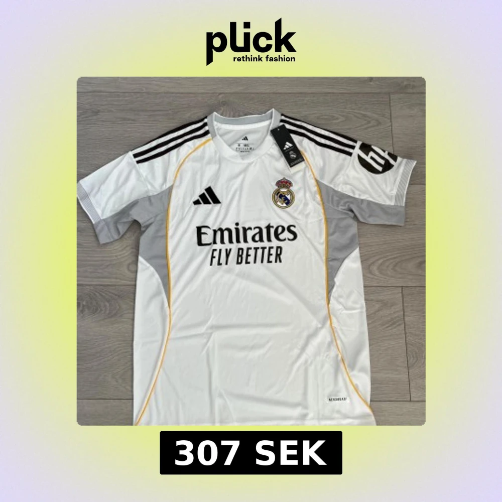 Real Madrid fotbollströja i vit med svarta Adidas-ränder på axlarna och HP-logga på ärmen. Säsong 25-26