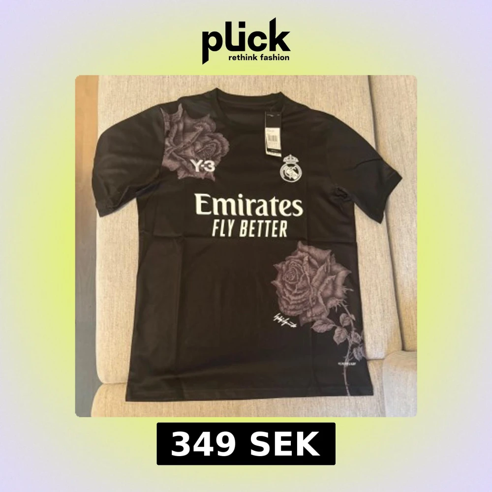 Svart Real Madrid fotbollströja i samarbete med Y-3, med stora gråa rosor som tryck på fram- och baksidan. Klassisk rund hals, korta ärmar och vit logga samt text på bröstet. Tillverkad i lätt polyester med Aeroready-teknologi för skön känsla.