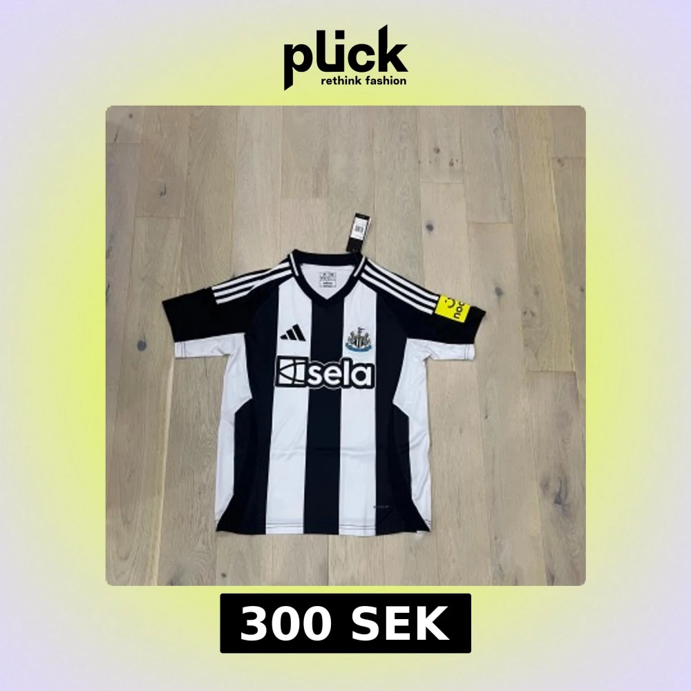Snygg Newcastle United fotbollströja från adidas med klassiska svarta och vita ränder, klubbmärke på bröstet och sponsorlogga. Tröjan har korta ärmar, gula detaljer på ärmen och är tillverkad i lätt och ventilerande material.