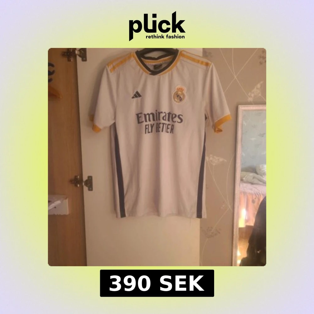 Säljer en officiell Real Madrid fotbollströja från Adidas med Vinicius Jr. och nummer 7 på ryggen. Tröjan är vit med gula och mörkblå detaljer, korta ärmar och klubbmärke på bröstet. Materialet är lätt och andas, perfekt för match eller träning.