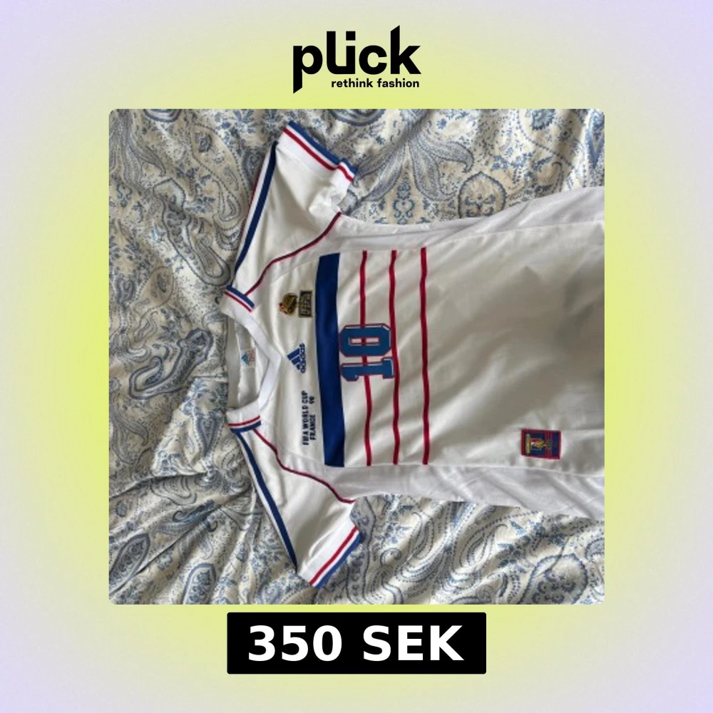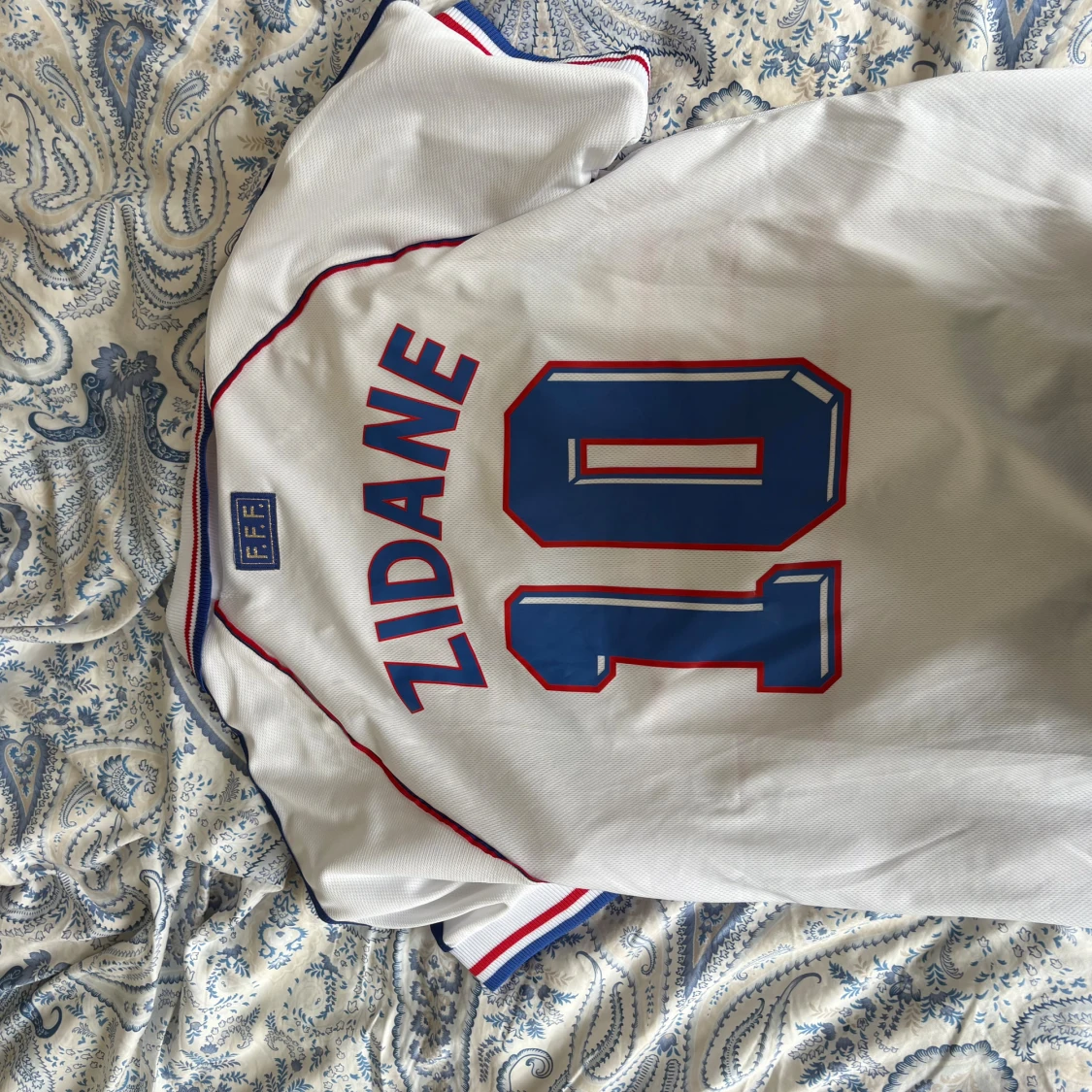 Klassisk vit fotbollströja från Adidas, Frankrikes landslag VM 1998 med Zidane 10 på ryggen. Tröjan har blå och röda detaljer, tunna röda ränder framtill och broderade märken. Kortärmad modell i lätt och ventilerande material.