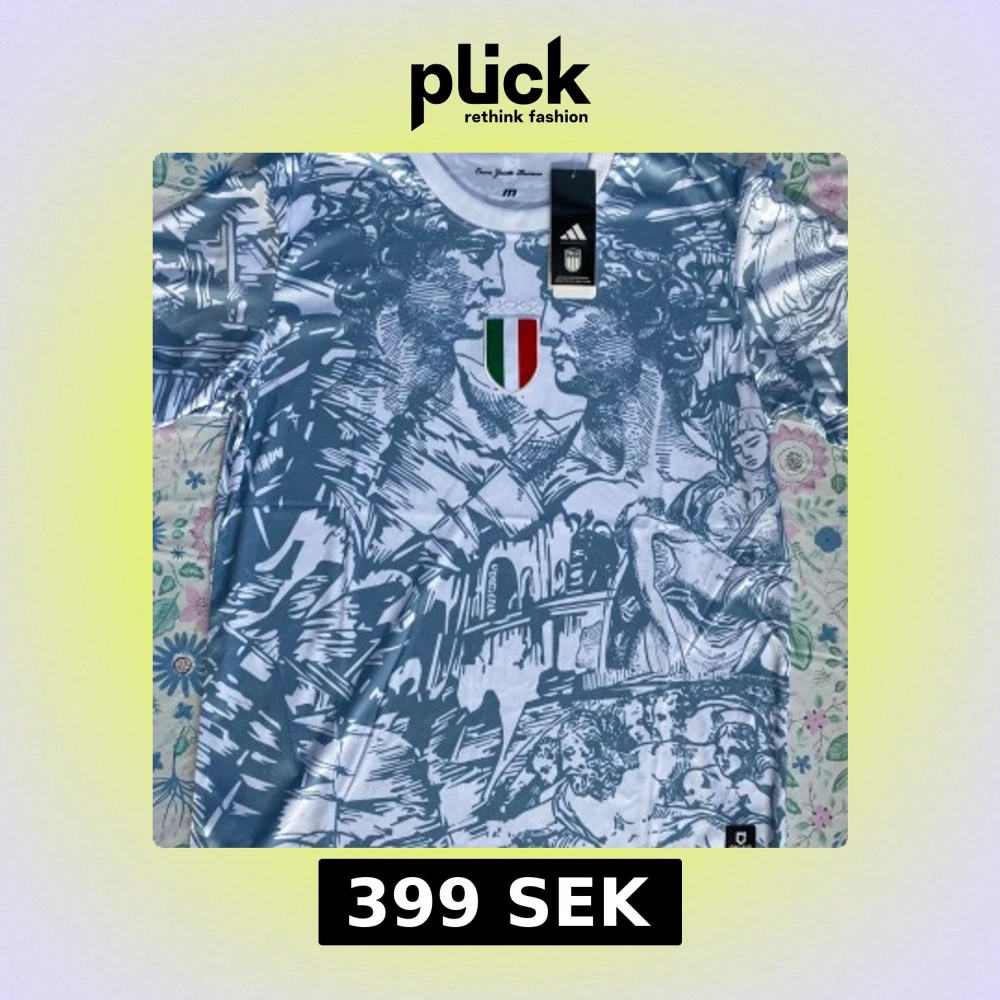 Snygg kortärmad Italien fotbollströja från Adidas med konstnärligt tryck i blått och vitt, samt broderat italienskt klubbmärke med stjärnor på bröstet. Materialet är lätt och andas, perfekt för match eller träning. Rund hals och officiell licens.