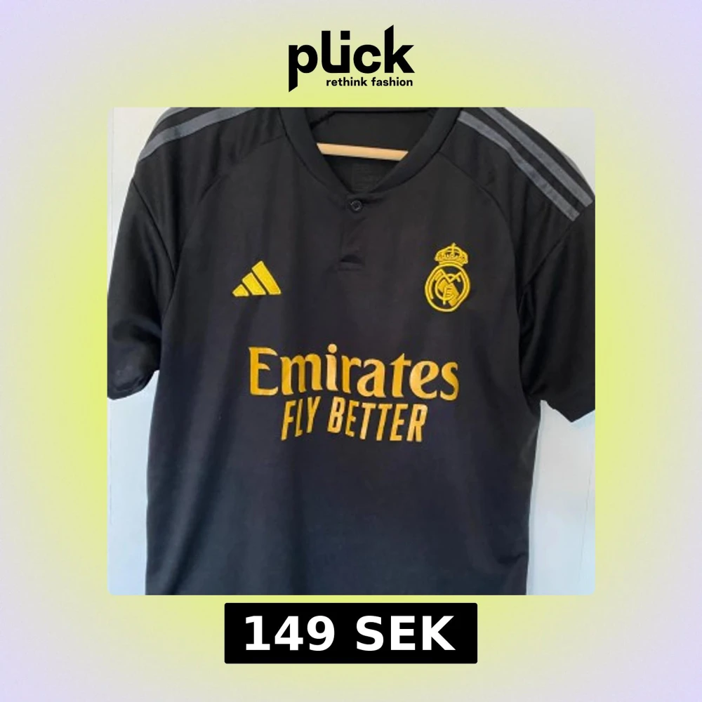 Säljer en svart Real Madrid fotbollströja från Adidas med gula detaljer och klubbmärke på bröstet. Tröjan har korta ärmar och klassiska Adidas-ränder på axlarna. Perfekt för både sport användning och daglig användning 💯